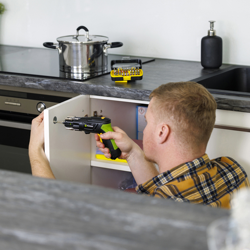 - Folosește șurubelnița electrică pentru înșurubare/ deșurubare cu biții incluși
