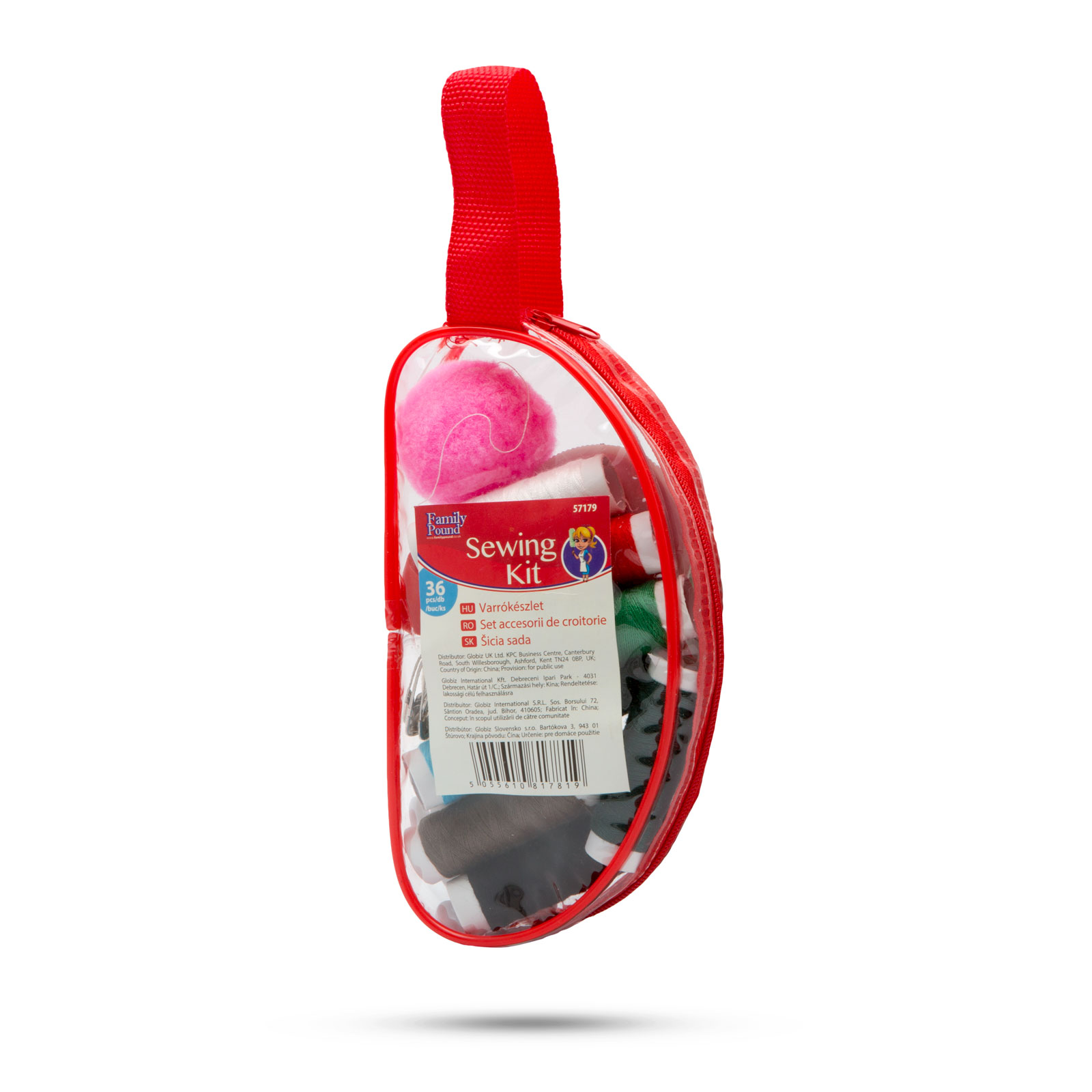 Trusă pt. croitorie multifuncţional. Accesoriu util în orice gospodărie. Aţă 12 culori, foarfecă de călătorie, 10 ace de siguranţă (2,5 cm), panglică de măsurare 60 cm, 4 nasturi albe, degetar mat. plastic, perniţă pt. ace, husă cu fermoar.