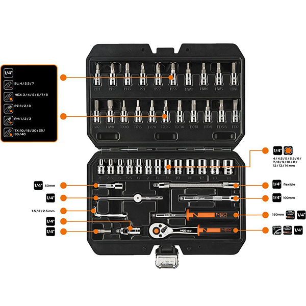 Trusa scule 1/4" 46 piese NEO TOOLS 10-004 HardWork ToolsRange