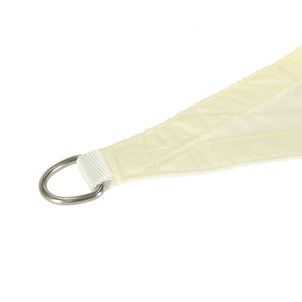 Velă de umbrire triunghiulară – Formă funcțională, colțuri întărite și mobilitate. Forma triunghiulară a velei de umbrire permite o adaptare flexibilă la orice spațiu, în timp ce colțurile special întărite cresc rezistența și tensiunea materialului. Marginile de montare întărite și inelele speciale în formă de D asigură stabilitatea și instalarea sigură .