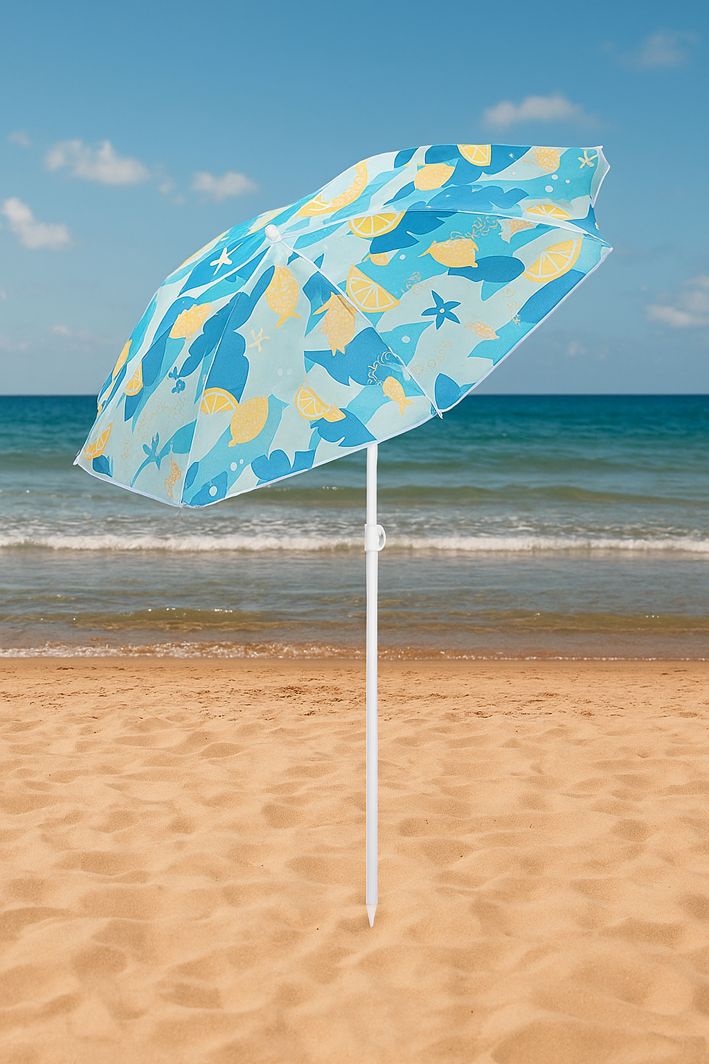 Specificatii tehnice Model: LEMON Dimensiune totala parasol: aprox. 160 cm (masurata pe material) Diametru interior util: aprox. 140 cm Inaltime reglabila: intre aprox. 115 – 170 cm Numar spite: 8 buc, lungime 76 cm Diametru spite: 2,5 mm Material parasol si husa: poliester 170T cu fereastra PVC Material structura: otel vopsit, tija 19/22 mm Reglaj unghi inclinare: da Varf tip tarus: da, conic Culoare: albastru, galben, turcoaz, roz Scurta descriere Umbrela de plaja iti ofera confort si umbra oriunde ai nevoie – la mare, pe balcon sau in gradina. Cu structura stabila din otel, reglaj de inaltime si unghi, si material rezistent, este alegerea ideala pentru zilele toride sau ploile usoare. Caracteristici principale Protectie solara si umbra placuta datorita cupolei largi Material durabil din poliester 170T, rezistent la intemperii usoare Structura metalica solida din otel, formata din 2 segmente Reglaj de inaltime si unghi pentru o pozitionare optima Sistem simplu de pliere si transport facil Potrivit pentru plaja, gradina, balcon sau picnic