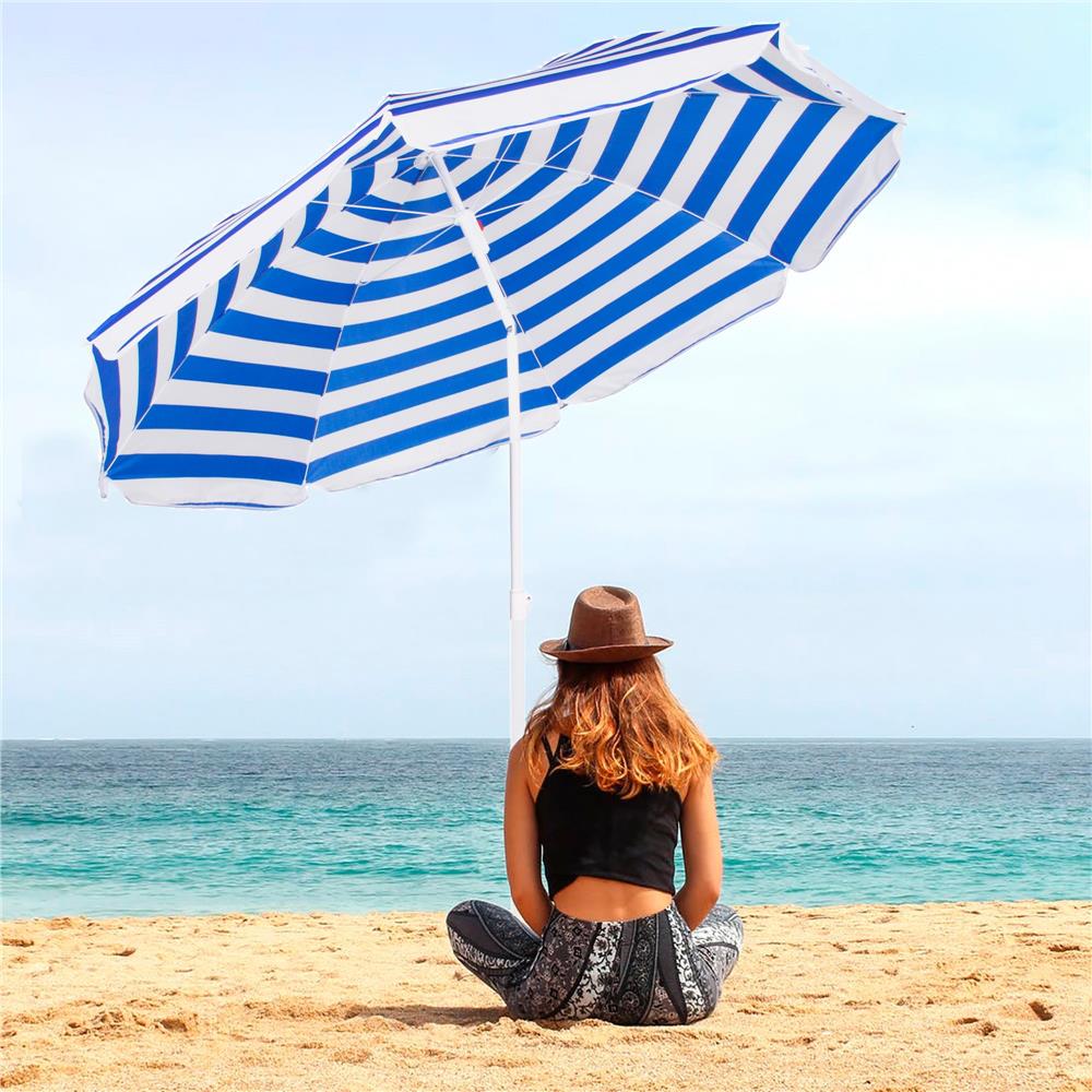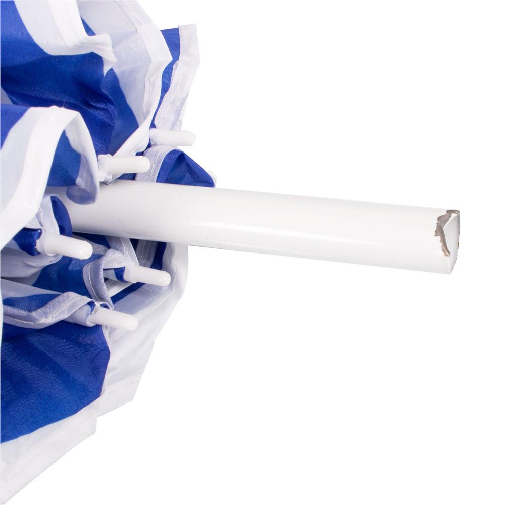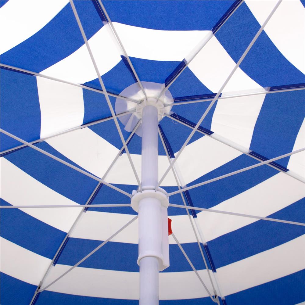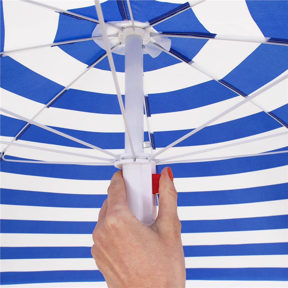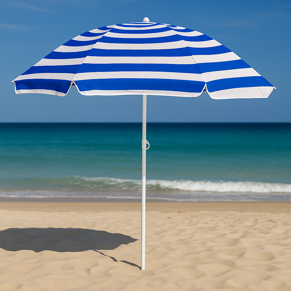 Specificatii tehnice: Material: Poliester Culoare: Albastru, alb Tip produs: Parasol clasic Diametru umbrela: 180 cm (material) / 160 cm (deschidere efectiva) Reglaj inaltime: 117–187 cm Inaltime maxima: 175 cm Numar panouri: 8 Sistem inclinare: Da Structura: Tija din doua segmente, cu varf conic pentru fixare in sol Accesorii incluse: Husa cu maner de transport Diametru tija: 23 mm Lungime pliat: 100 cm Scurta descriere: Aceasta umbrela de plaja ofera umbra generoasa si protectie eficienta in zilele insorite. Este pliabila, usoara si usor de transportat, cu sistem de inclinare si inaltime reglabila. Poate fi fixata direct in sol, fara suport suplimentar, si este potrivita pentru plaja, gradina sau iesiri in aer liber. Caracteristici principale: Cupa mare de 180 cm pentru umbra generoasa Material rezistent din poliester Sistem de reglare a inaltimii Tija reglabila cu functie de inclinare pentru orientarea umbrei in functie de soare Structura usoara si usor de transportat Tija cu varf conic pentru fixare usoara in sol Ideal pentru plaja, balcon, picnic, camping