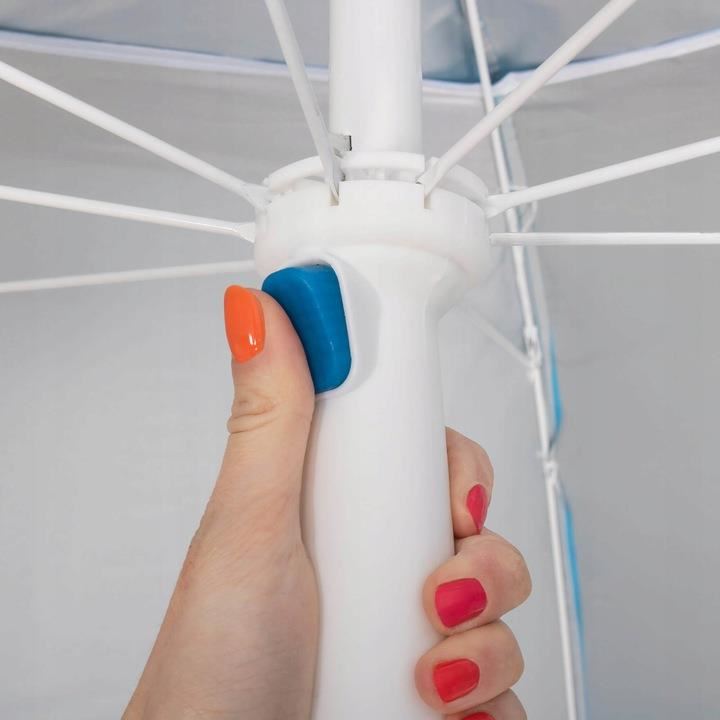 Utilizare: Deschide umbrela, regleaza inaltimea dorita si fixeaz-o in sol cu ajutorul sistemului de prindere si al carligelor incluse. Peretii laterali pot fi pozitionati pentru o protectie mai buna in functie de vant si de directia soarelui.