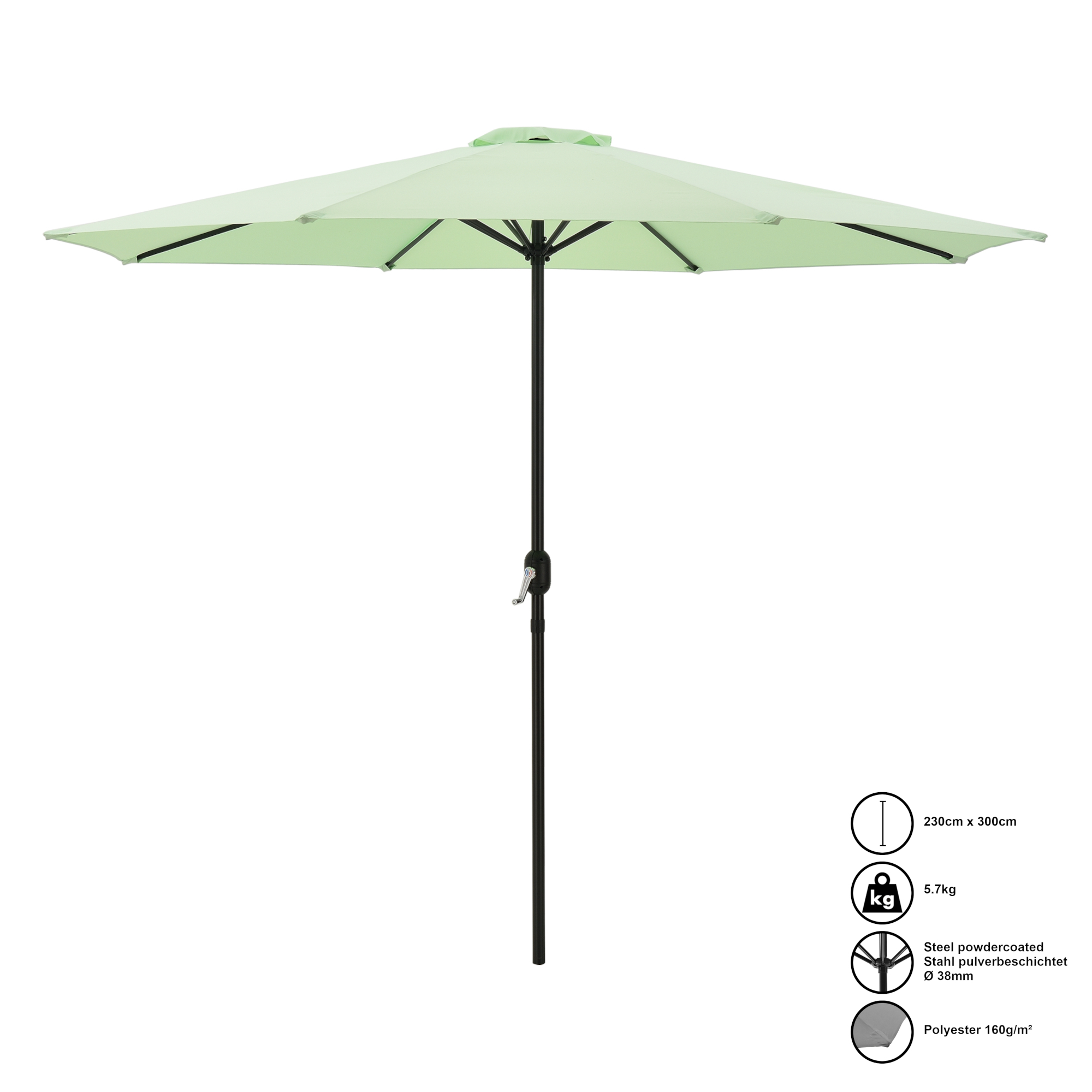 Umbrelă de soare Budapest 300x230 cm verde pastel este alegerea ideală pentru amenajarea unui spațiu confortabil în aer liber. Potrivită pentru terasă, grădină sau zona de relaxare, această umbrelă de soare oferă umbră generoasă în zilele călduroase și un plus de stil datorită nuanței moderne de verde pastel.