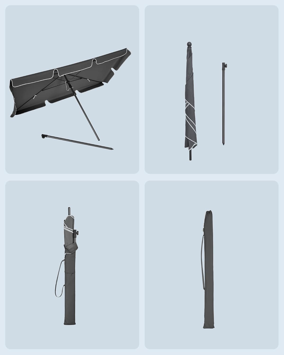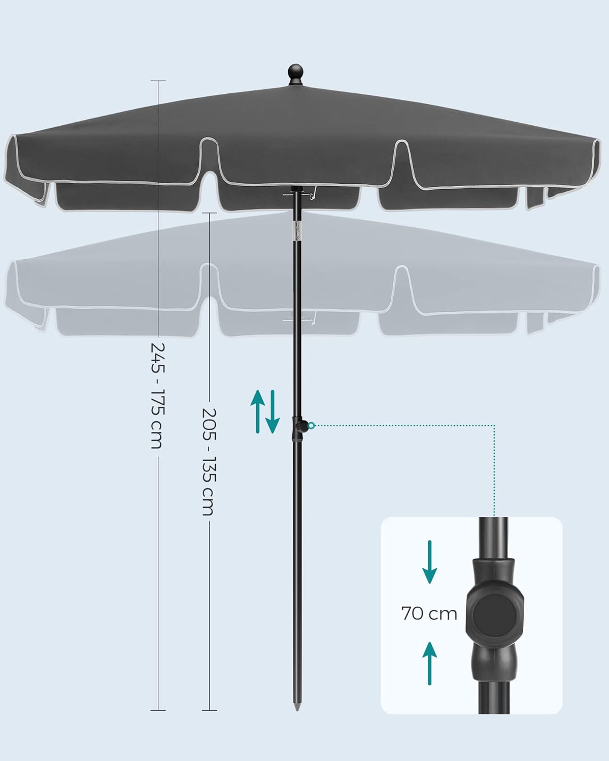 Bucură-te de mai mult confort în aer liber cu această umbrelă de terasă SONGMICS, ideală pentru grădină, balcon, curte sau plajă. Modelul dreptunghiular de 230 x 150 cm oferă o zonă generoasă de umbră, iar materialul rezistent cu protecție UV UPF 50+ te ajută să stai mai relaxat în zilele însorite. Datorită funcției de reglare pe înălțime și a sistemului de înclinare în 2 direcții, poți adapta ușor umbrela în funcție de poziția soarelui.