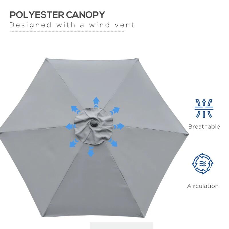 Robustă și Durabilă: Stalpul și cele 6 nervuri metalice conferă umbrelei o structură robustă și o rezistență îndelungată în timp. Orificiile de aerisire din partea superioară permit o bună ventilare și îmbunătățesc rezistența la vânt.