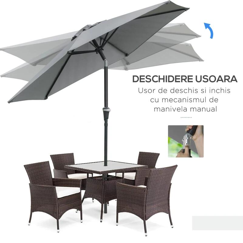 Ușor de Utilizat: Dotată cu un dispozitiv cu manivelă, umbrela este ușor de deschis și închis. Asamblarea este simplă datorită conectării rapide a stâlpilor superiori și inferiori prin intermediul unui buton.