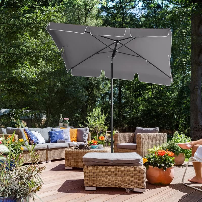 Bucură-te de umbră plăcută oriunde mergi cu această umbrelă de plajă și terasă SONGMICS, concepută pentru confort, protecție și utilizare ușoară. Forma dreptunghiulară este practică pentru spații variate, iar materialul rezistent oferă protecție UV UPF 50+, ideală în zilele însorite. Datorită sistemului de înclinare în 2 direcții și reglajului pe înălțime, poți adapta rapid umbra în funcție de poziția soarelui.