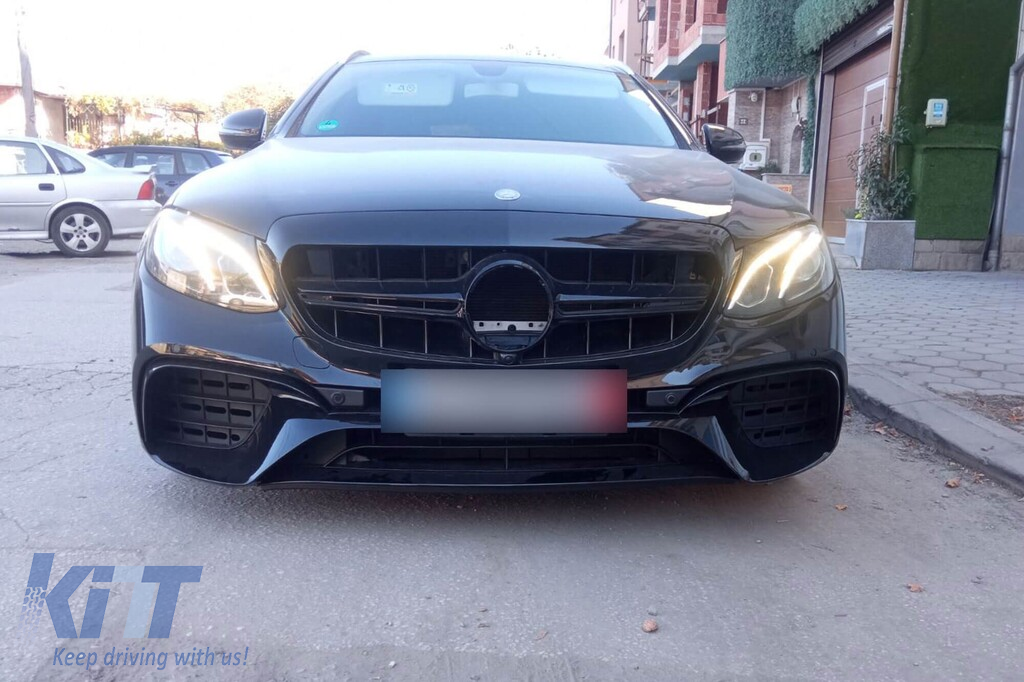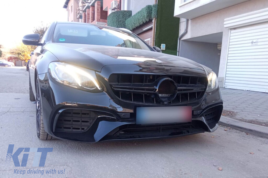 Un pachet de design tip E63 potrivit pentru Mercedes E-Class W213 2016-2019 cu ieșiri de evacuare negre și garnitură neagră, pentru modelul cu bara de protecție din spate standard. Performance AutoTuning