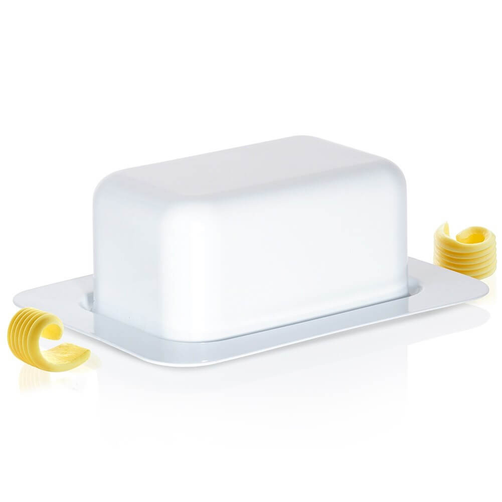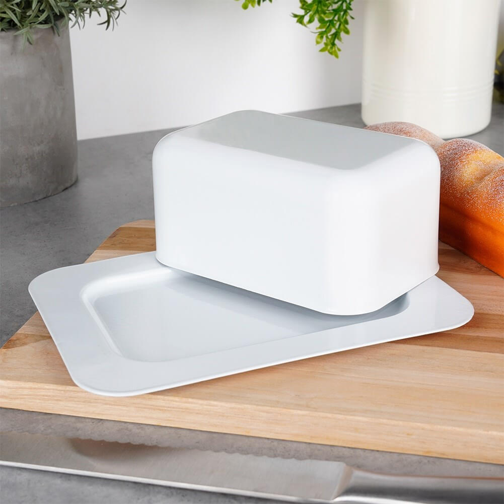 Completează-ți bucătăria cu o untieră practică și elegantă, perfectă pentru depozitarea untului în frigider și pentru servirea la masă. Realizată din oțel și finisată în alb, se potrivește ușor cu orice tip de veselă și păstrează untul protejat de mirosuri și impurități.
