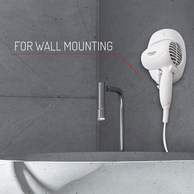 Practic și sigur, uscătorul de păr hotelier Adler cu montaj pe perete este alegerea ideală pentru baie, pensiuni sau spații de cazare. Oferă **uscare rapidă** și utilizare comodă, iar funcția de **oprire automată** ajută la protejarea aparatului după așezarea în suport.