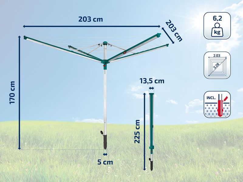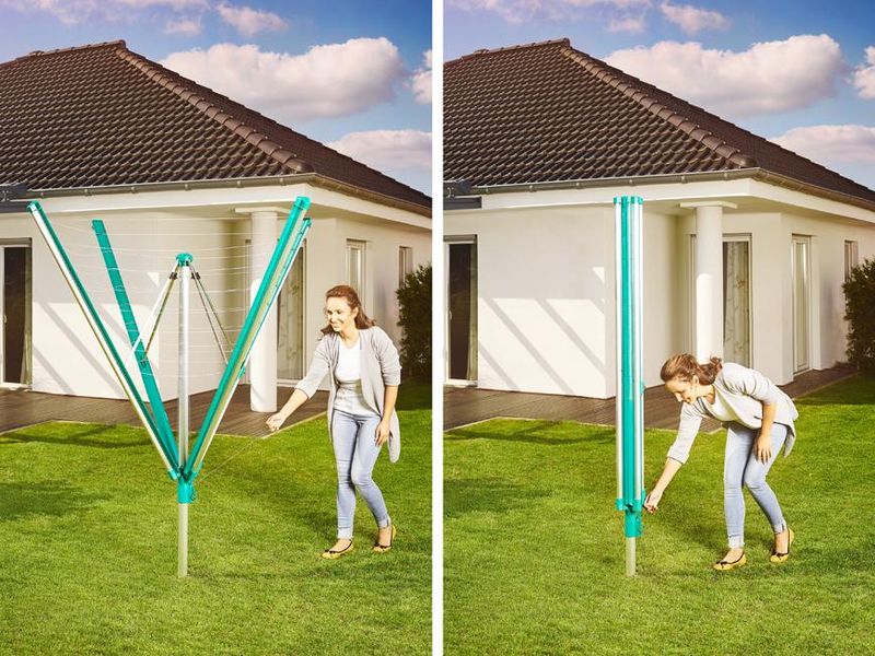 Datorită sistemului patentat de retragere a șnururilor în brațele laterale, firele rămân protejate de ploaie și murdărie atunci când uscătorul este închis. Sistemul Easy-Lift permite deschiderea simplă, prin apăsare de buton, iar închiderea se face ușor, fără să fie nevoie să vă aplecați. În plus, fiecare braț este prevăzut cu câte două suporturi pentru umerașe, utile pentru cămăși, bluze sau alte articole delicate.