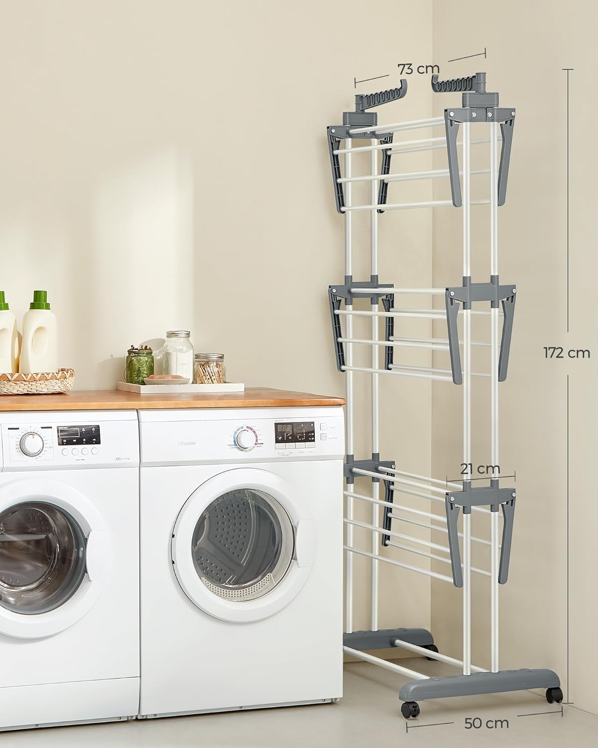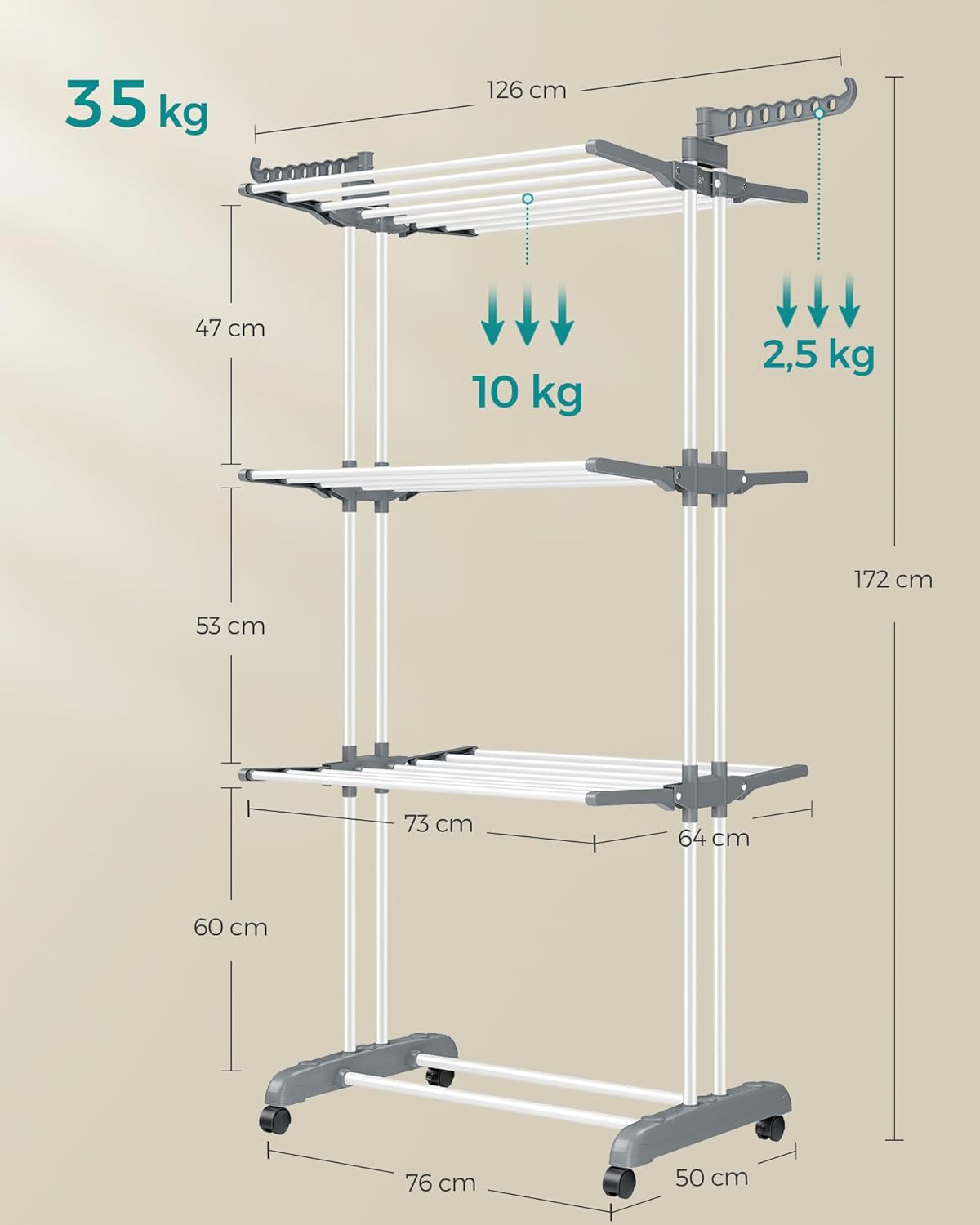 Rotile integrate permit mutarea ușoară dintr-o cameră în alta, iar sistemul de blocare ajută la fixarea lui în poziția dorită. Când nu este folosit, designul pliabil contribuie la economisirea spațiului, fiind o soluție excelentă pentru organizarea eficientă a rufelor la uscat.