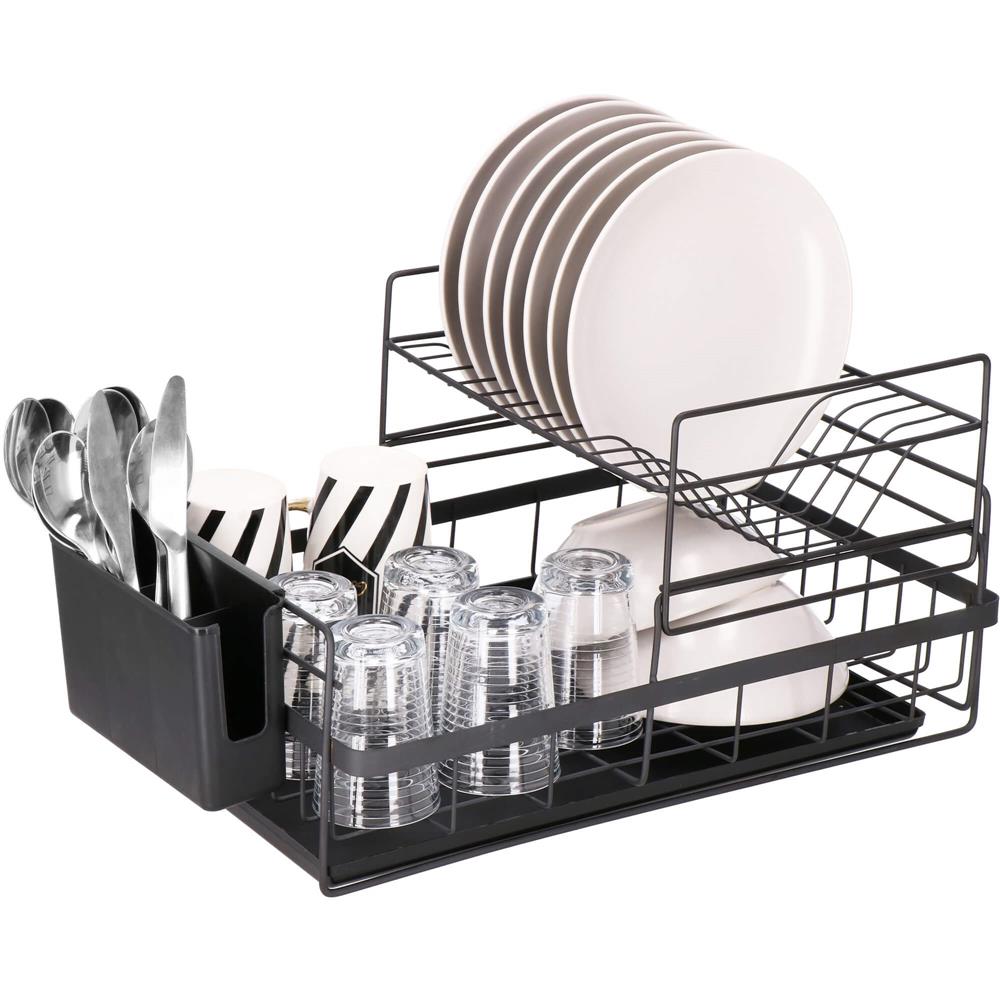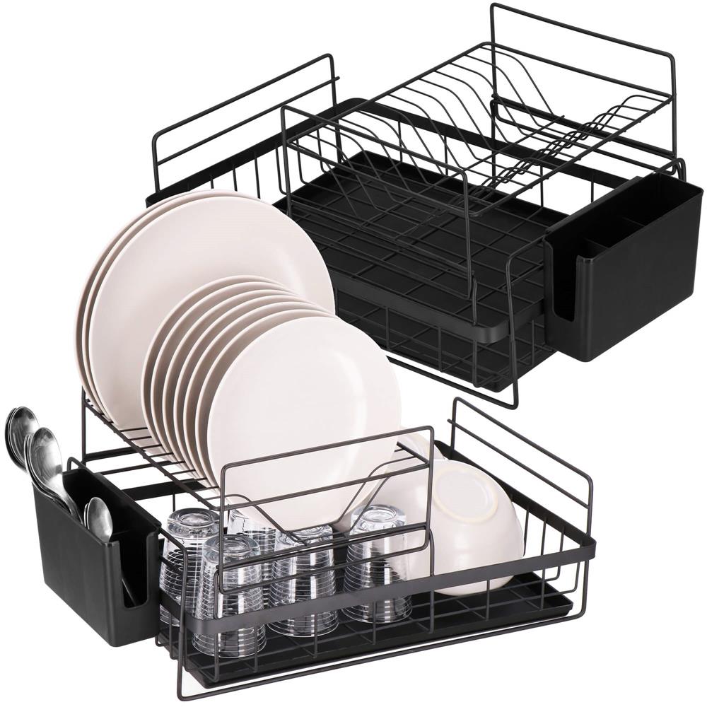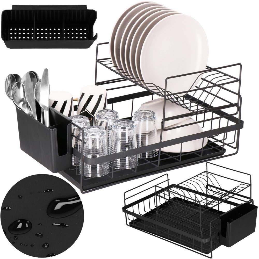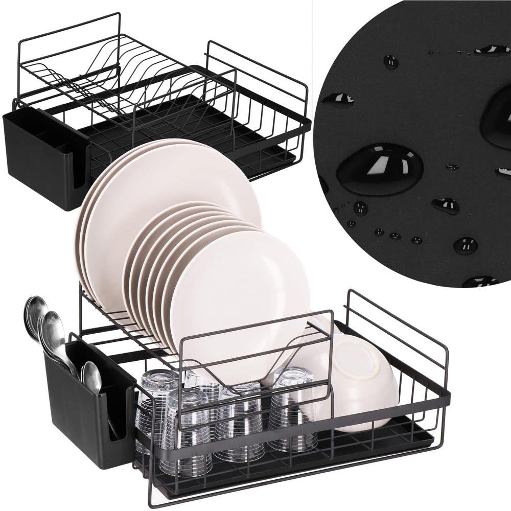 Uscator de vase din otel cu 2 nivele, tava de scurgere si suport tacamuri, negru