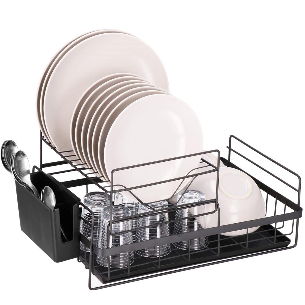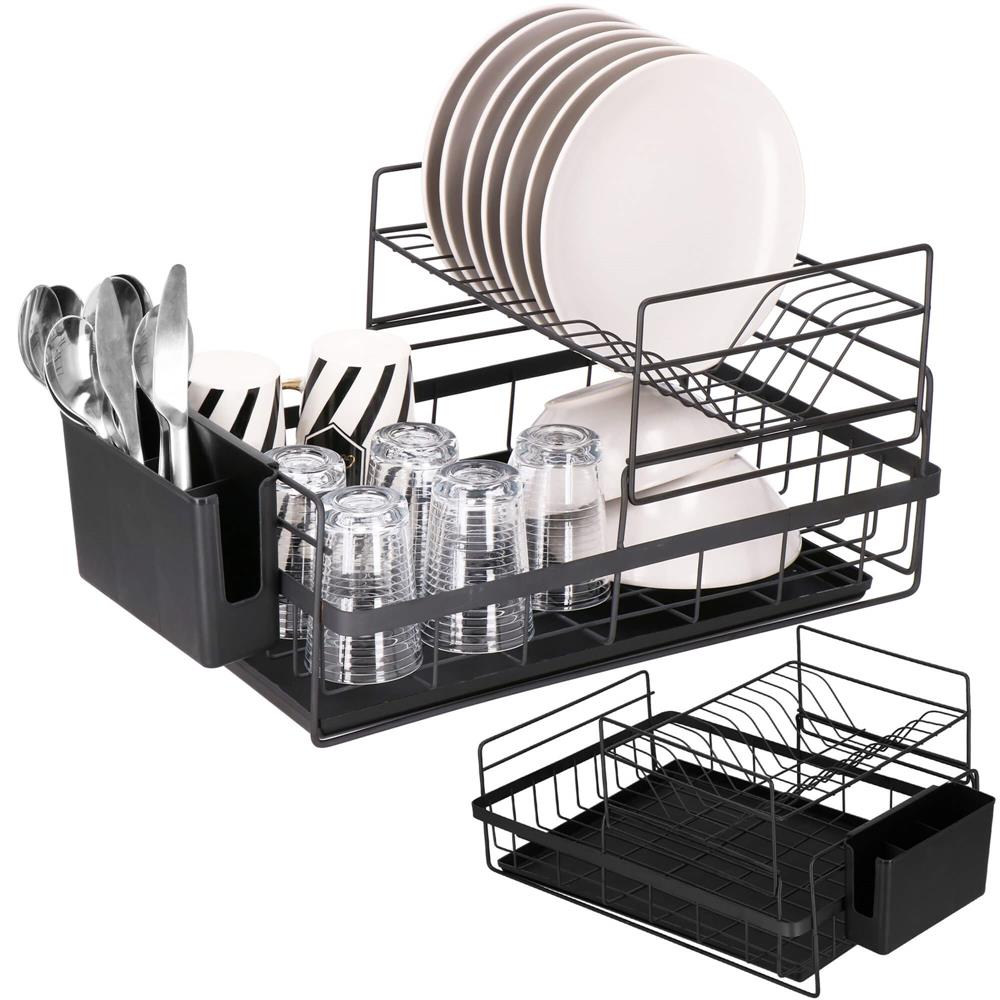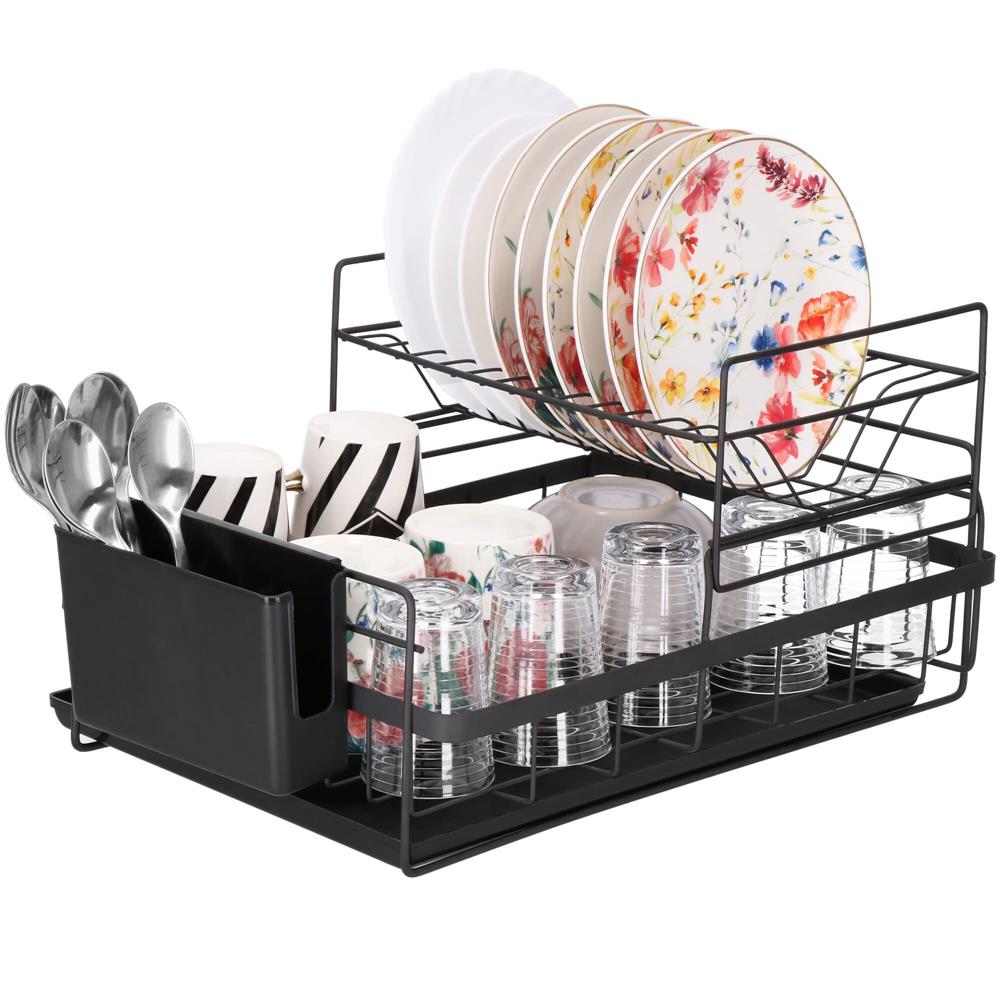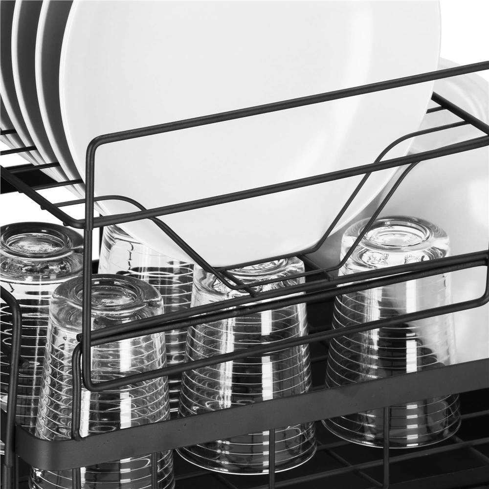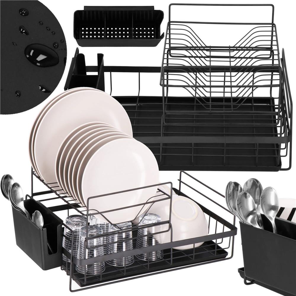 Uscator de vase din otel cu 2 nivele, tava de scurgere si suport tacamuri, negru
