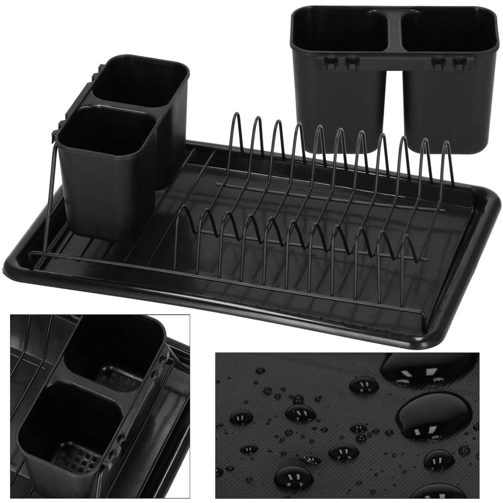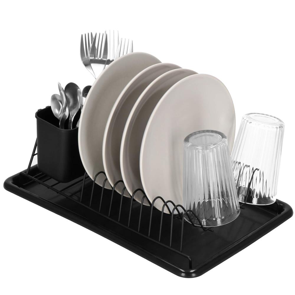 Uscător de vase metalic cu tavă detașabilă și suport tacâmuri, negru
