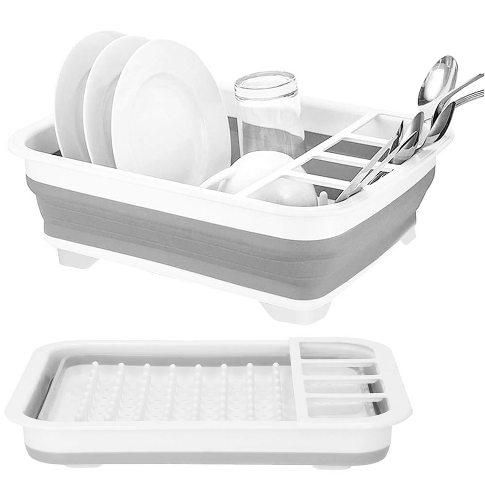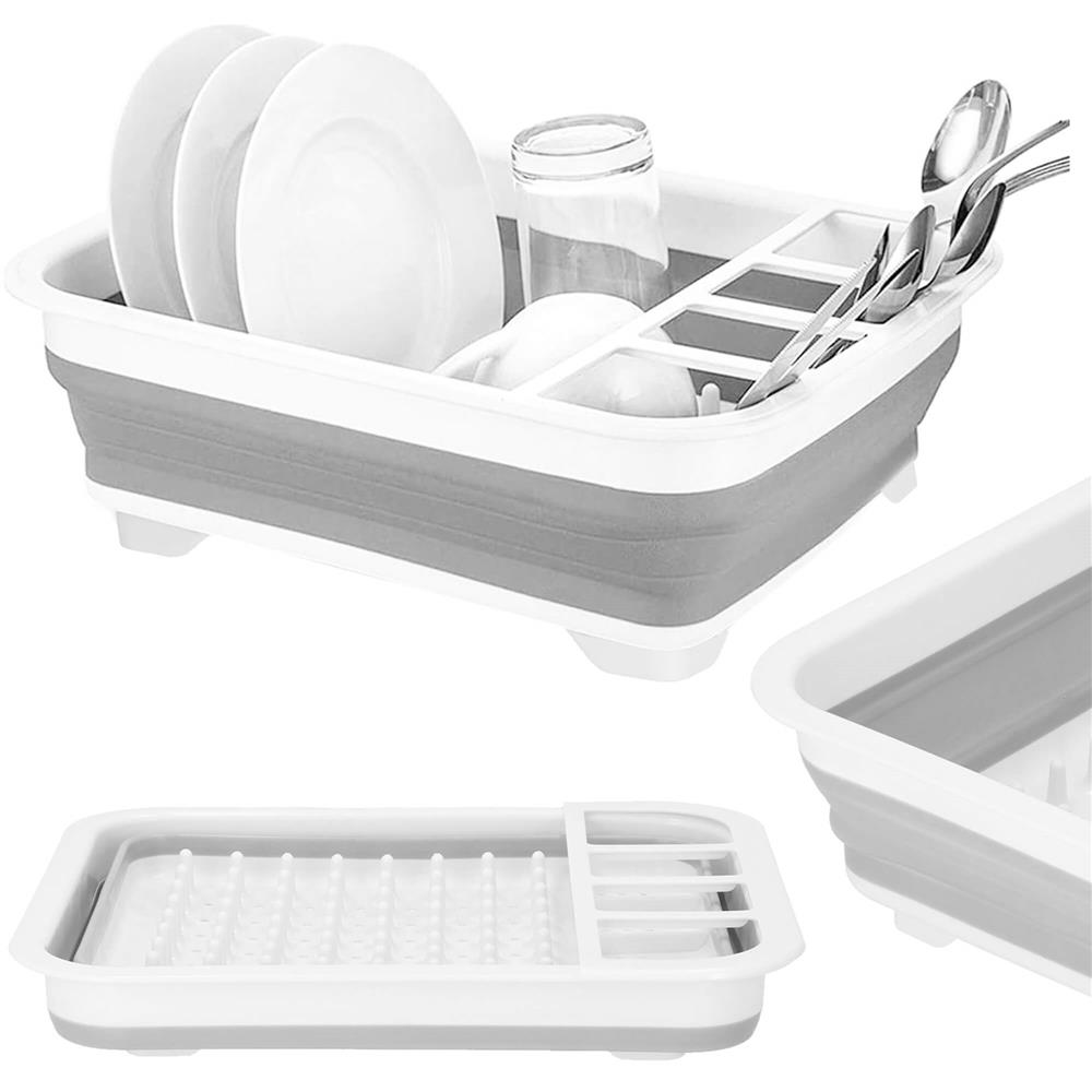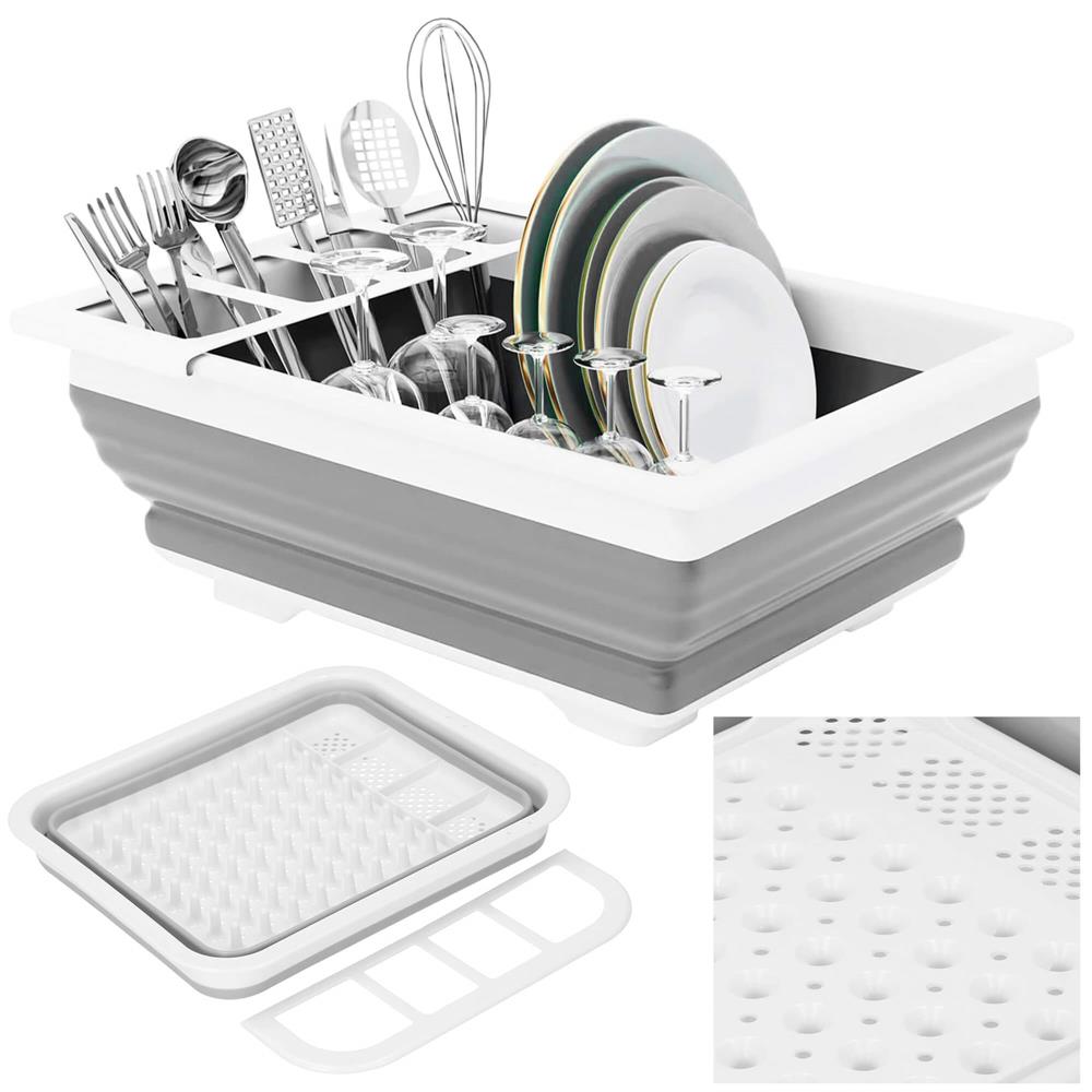 Uscător de vase pliabil din plastic și silicon, 36x31x12 cm, alb-gri