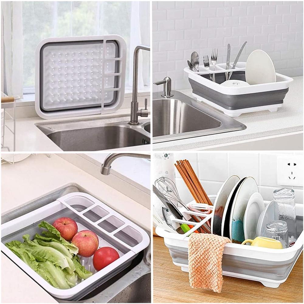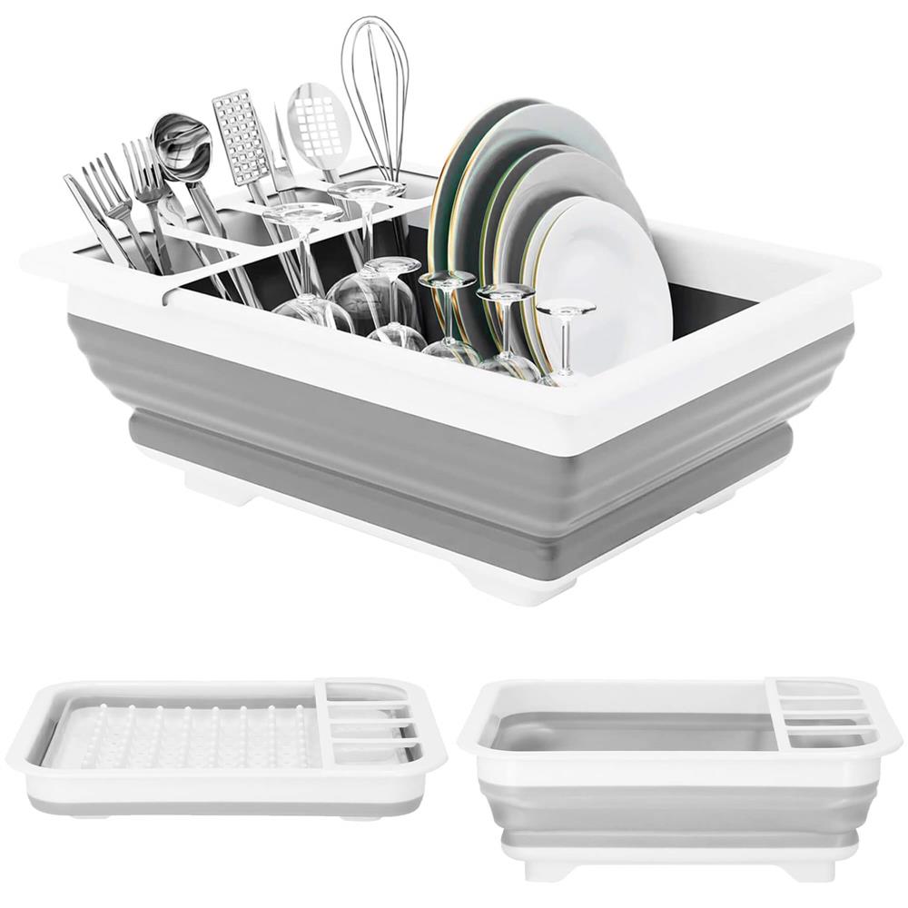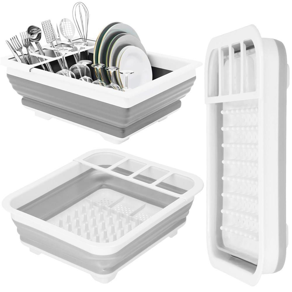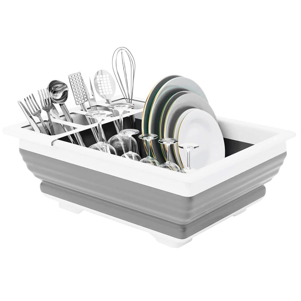 Uscător de vase pliabil din plastic și silicon, 36x31x12 cm, alb-gri