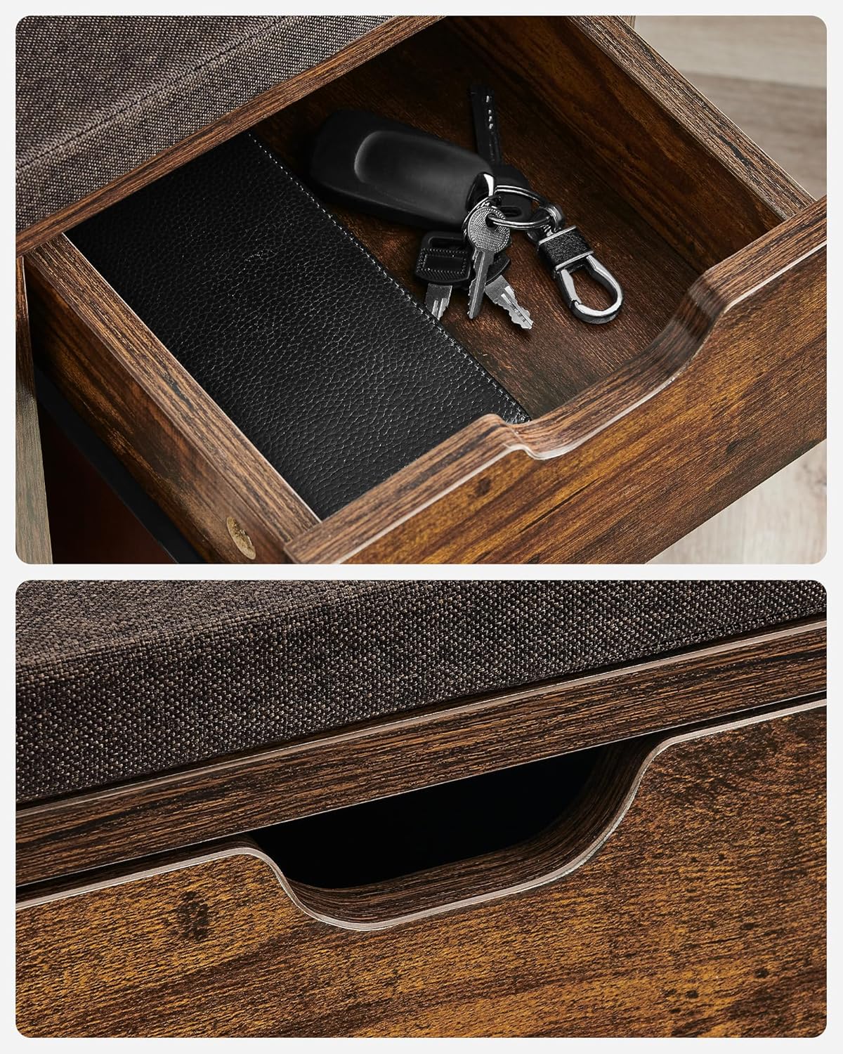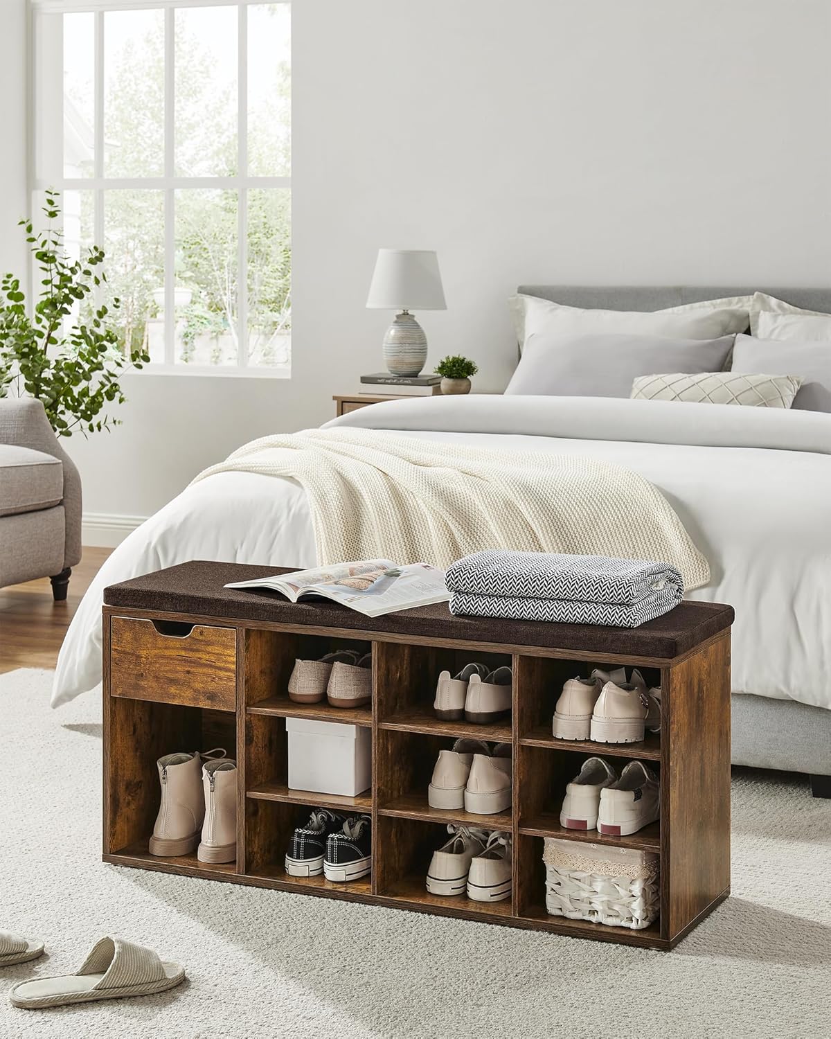VASAGLE Banca de depozitare cu suport pentru pantofi, 10 compartimente si dulap, cu perna, 30x104x48cm, maro rustic Household NewTrend