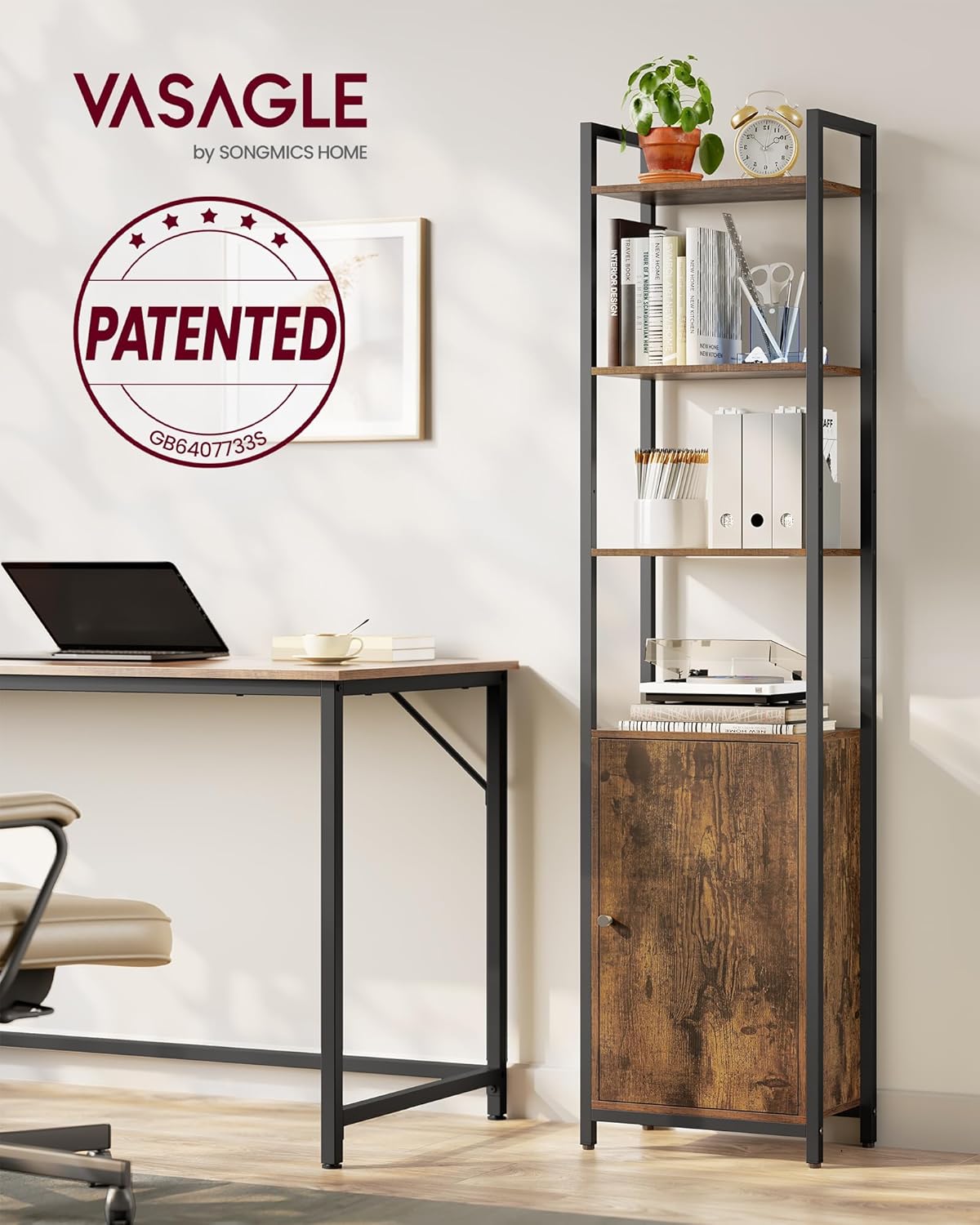 VASAGLE Biblioteca inalta cu 6 rafturi si dulap, cadru metalic, rafturi reglabile, stil vintage, 40x24x160 cm, maro rustic Household NewTrend