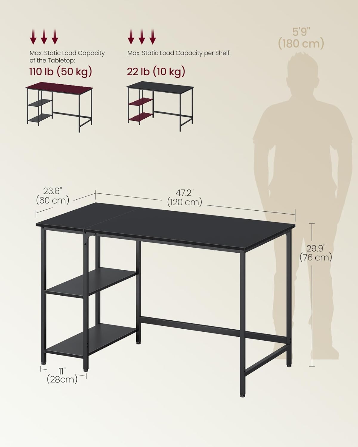 Specificatii tehnice Brand: VASAGLE Material blat: PAL (lemn prelucrat) Material cadru: Otel (aliaj metalic) Culoare: Negru Dimensiuni: 120 x 60 x 76 cm Capacitate maxima: 50 kg Numar rafturi: 2 (laterale, modulare) Montare rafturi: Stanga sau dreapta Picioare reglabile: Da Stil: Industrial Scurta descriere Biroul VASAGLE este alegerea ideala pentru un spatiu de lucru organizat si eficient. Cu un blat generos si rafturi laterale ajustabile, iti permite sa iti personalizezi zona de lucru in functie de nevoi. Designul industrial si structura solida il fac potrivit pentru orice birou modern. Caracteristici principale Blat spatios pentru laptop, monitoare si accesorii Rafturi laterale modulare montabile stanga sau dreapta Posibilitate de eliminare a raftului pentru obiecte mai mari Cadru metalic stabil si rezistent Picioare reglabile pentru stabilitate pe suprafete inegale Design industrial modern si versatil Protectie pentru podea impotriva zgarieturilor Asamblare usoara cu instructiuni clare