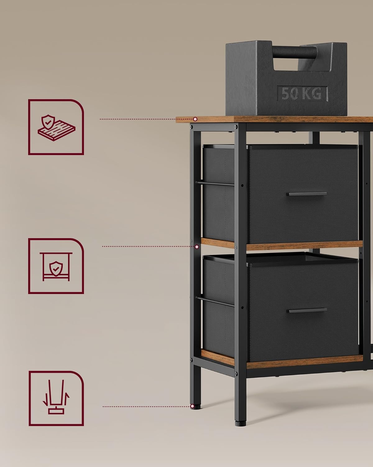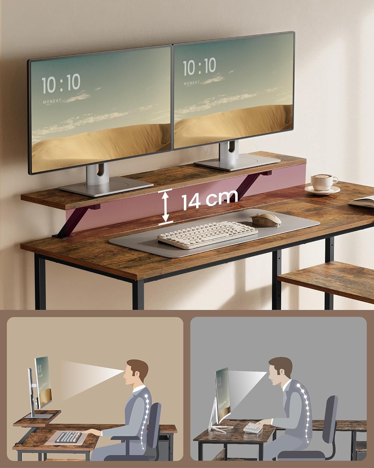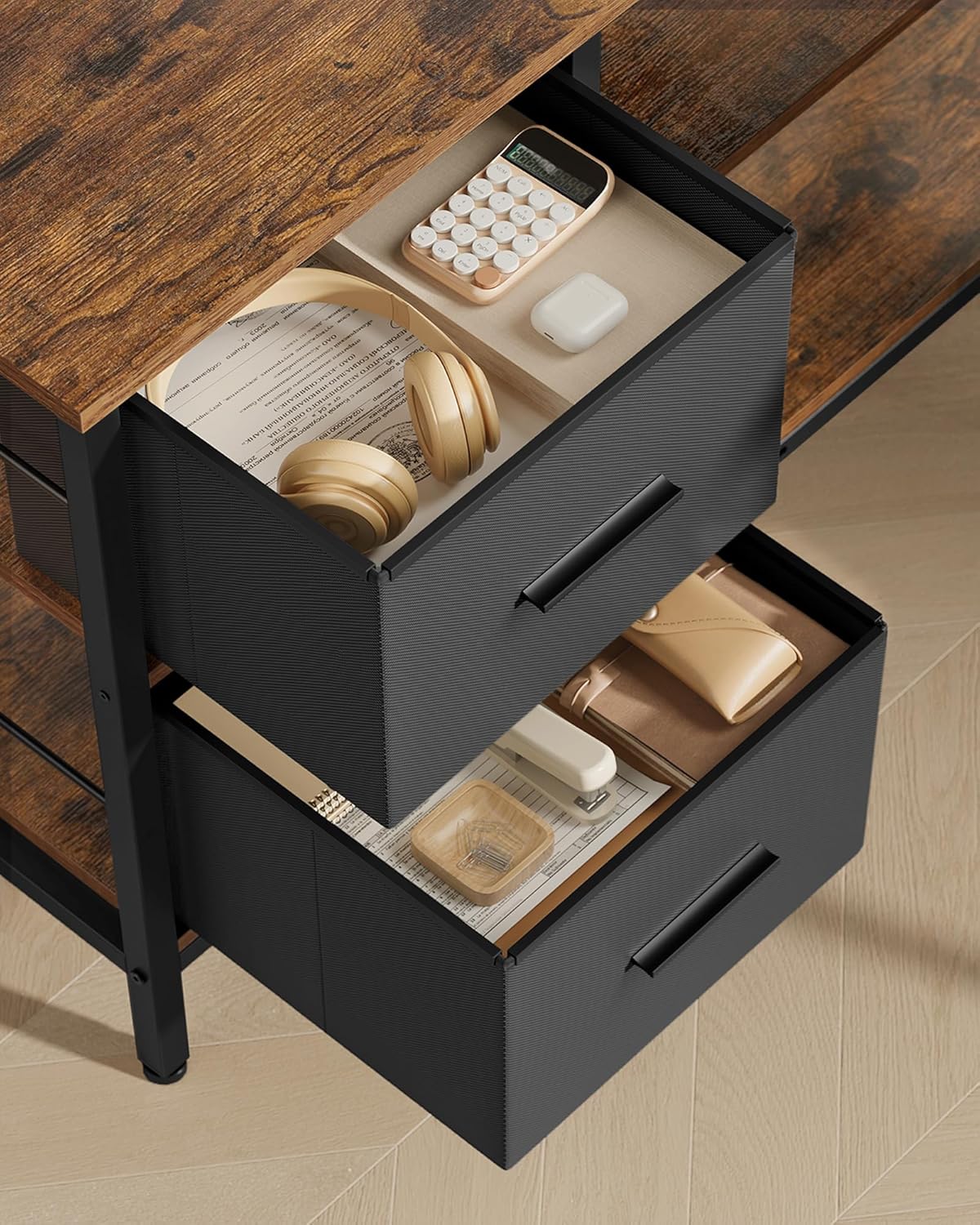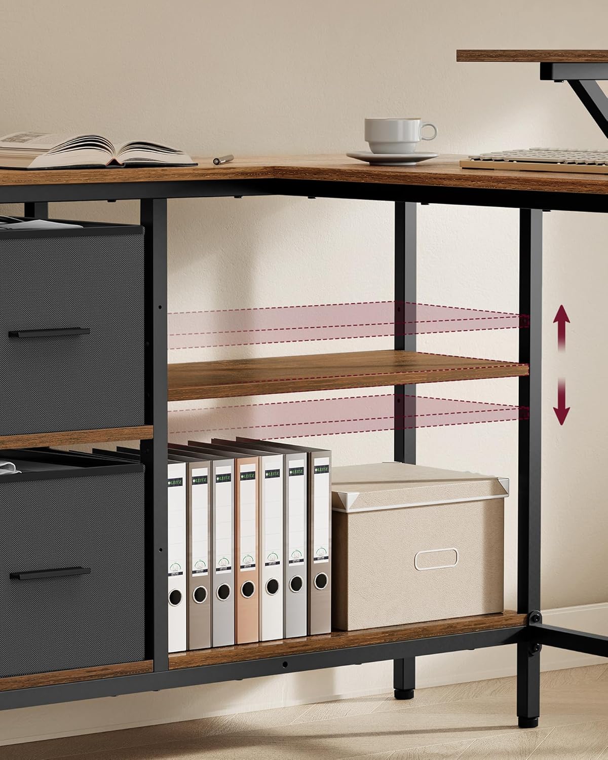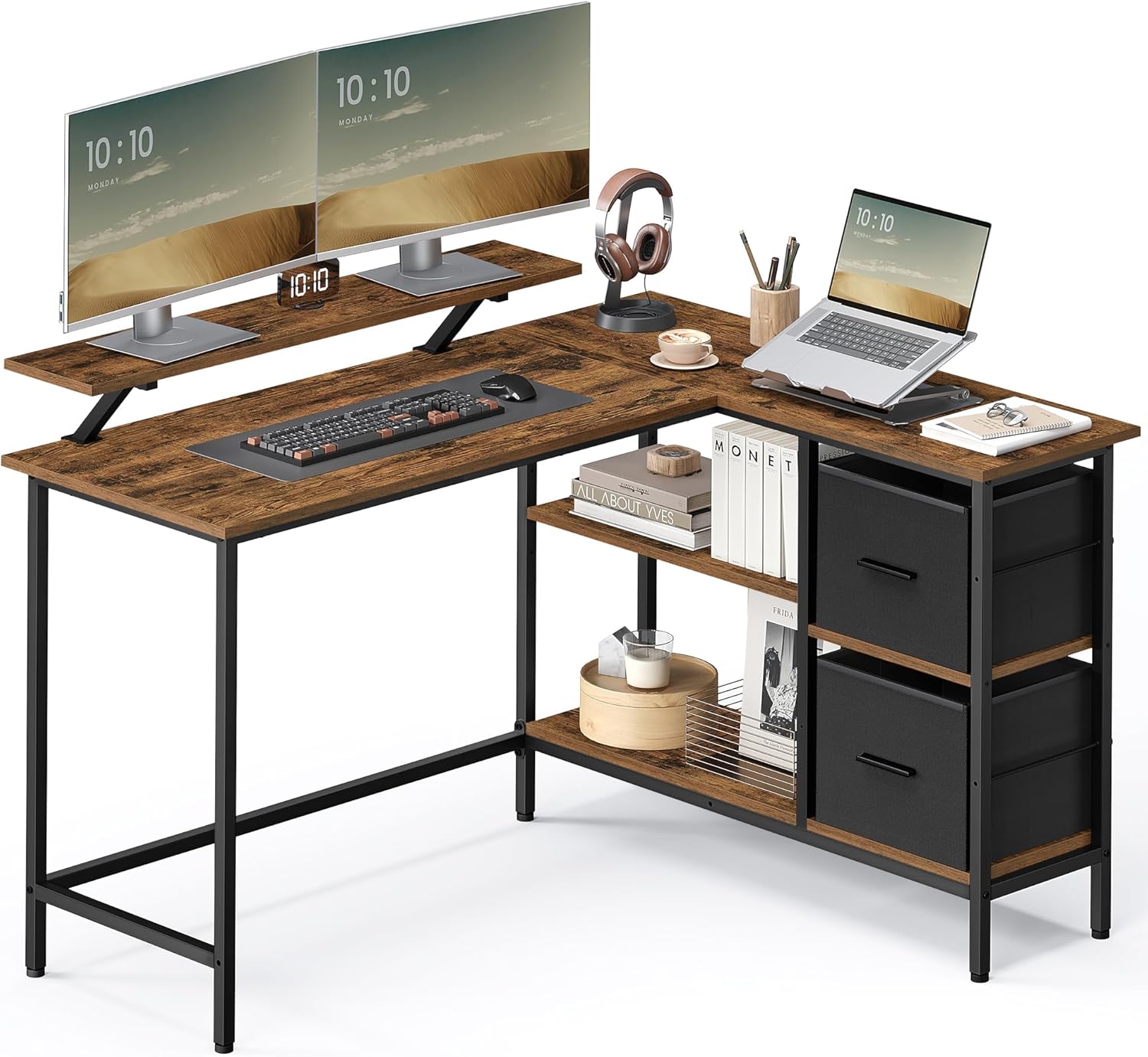 VASAGLE Birou in forma de L, suport monitor, 2 rafturi si 2 sertare, 105x135x76 cm, maro rustic Household NewTrend