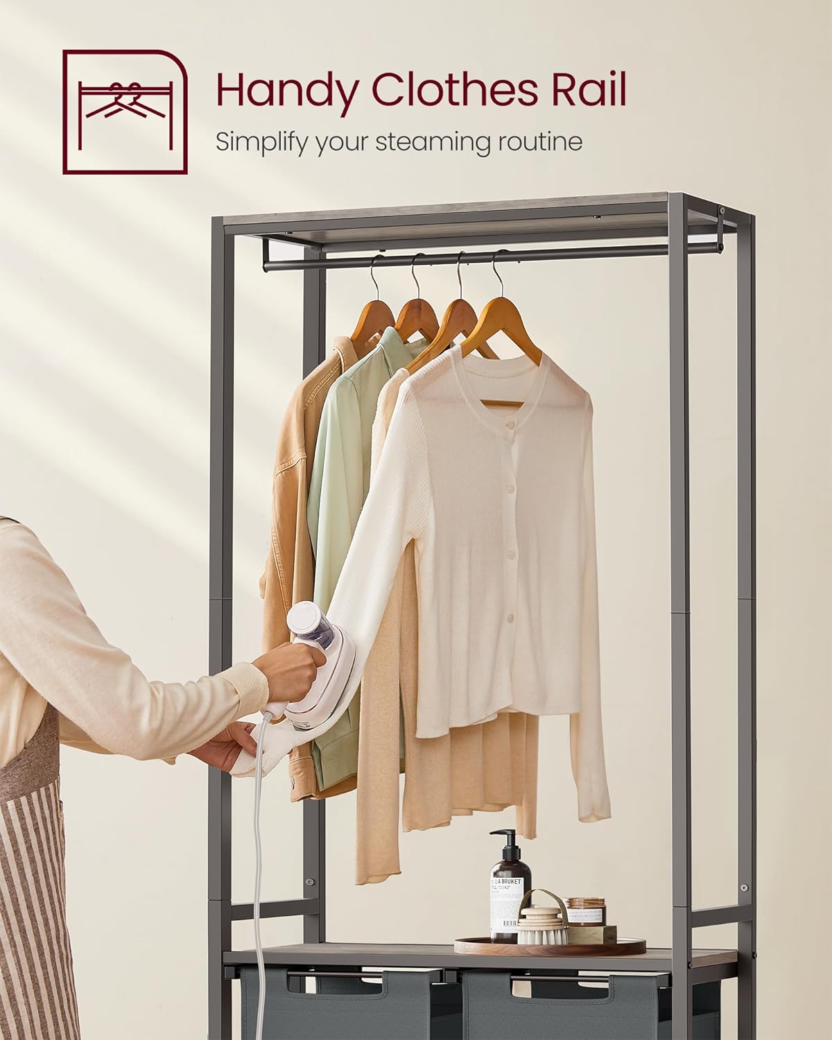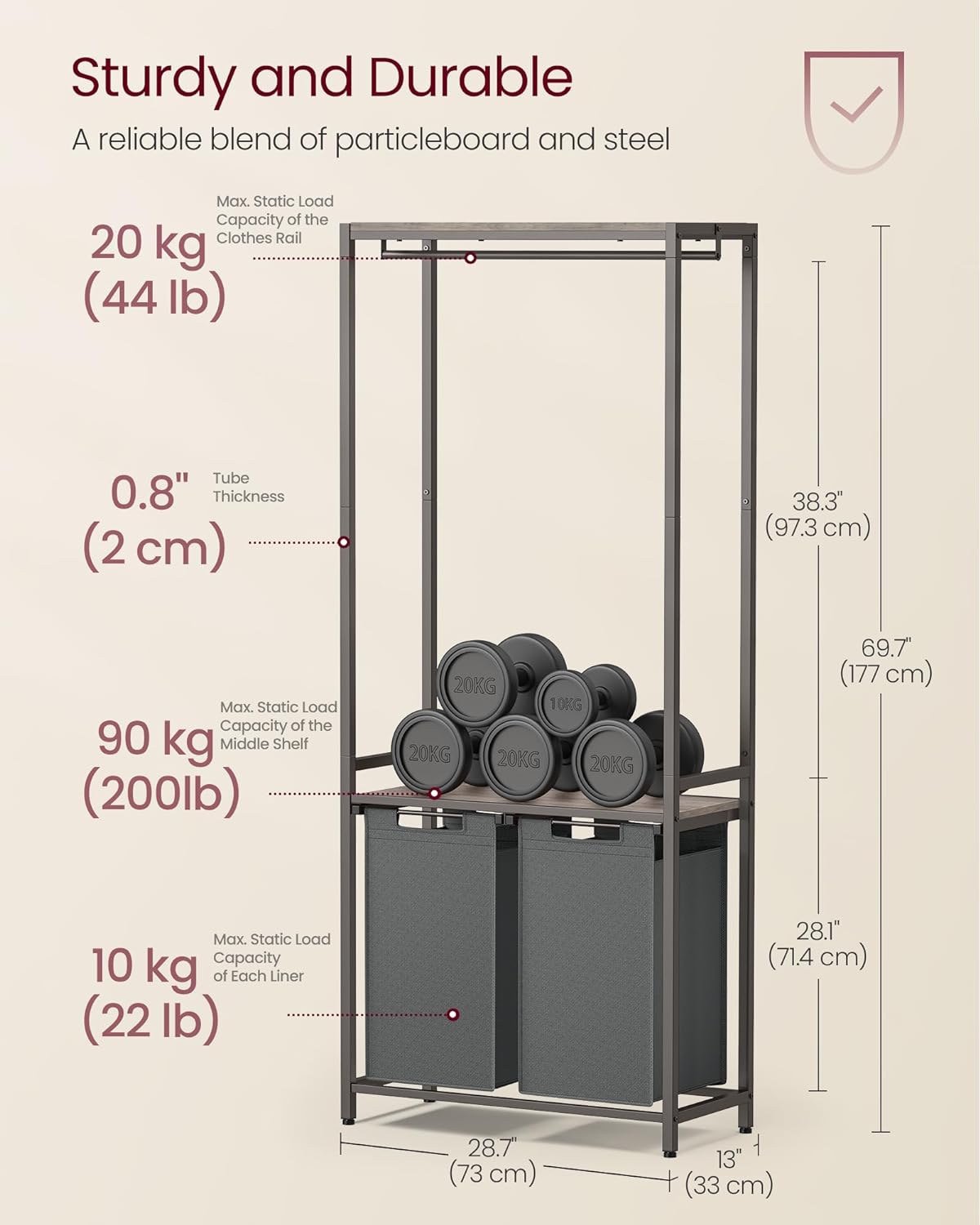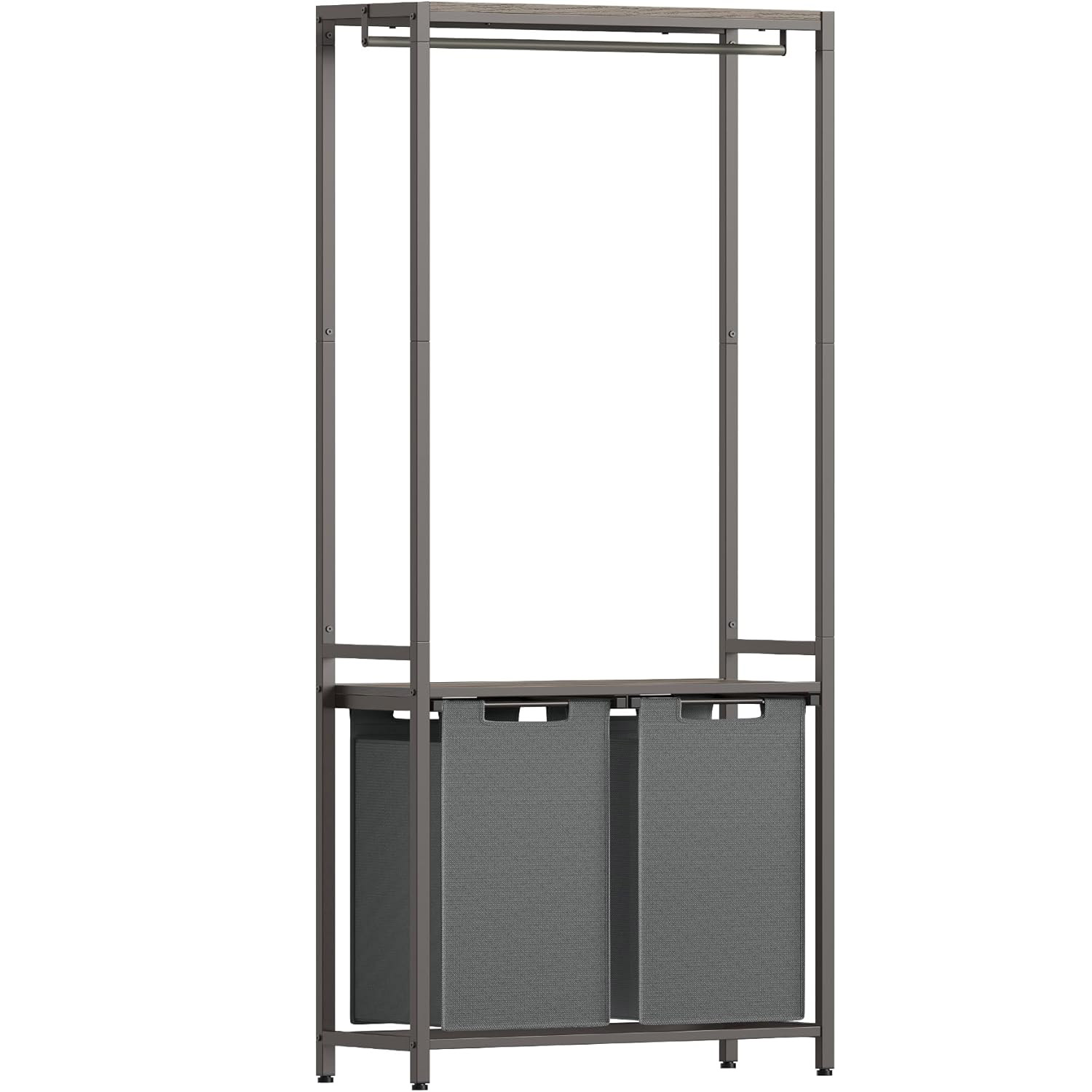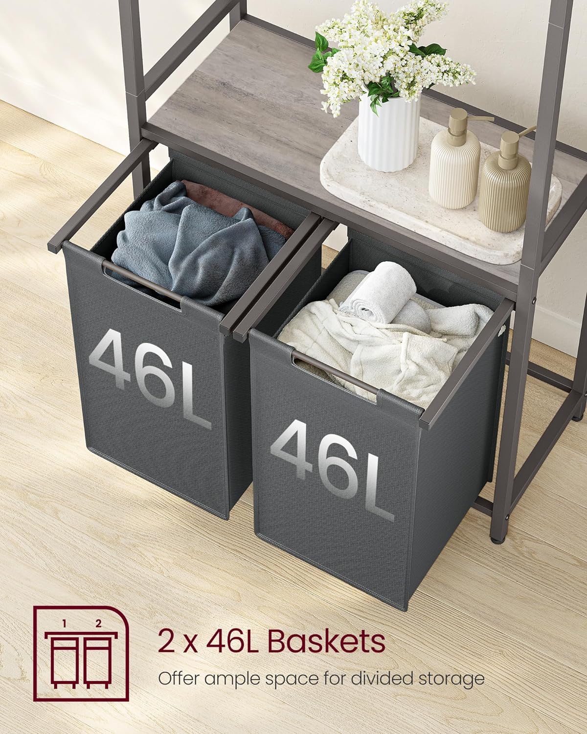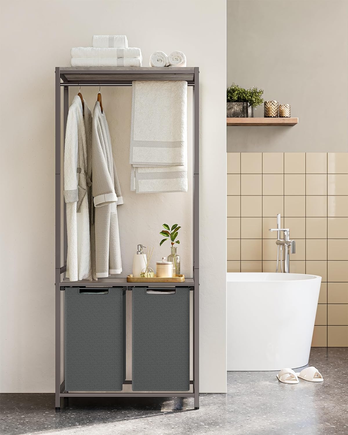 VASAGLE Cos de rufe, 2 compartimente, saci de rufe detasabili, 2 rafturi, tija umerase, 2x46L, 73x33x177cm, gri Household NewTrend