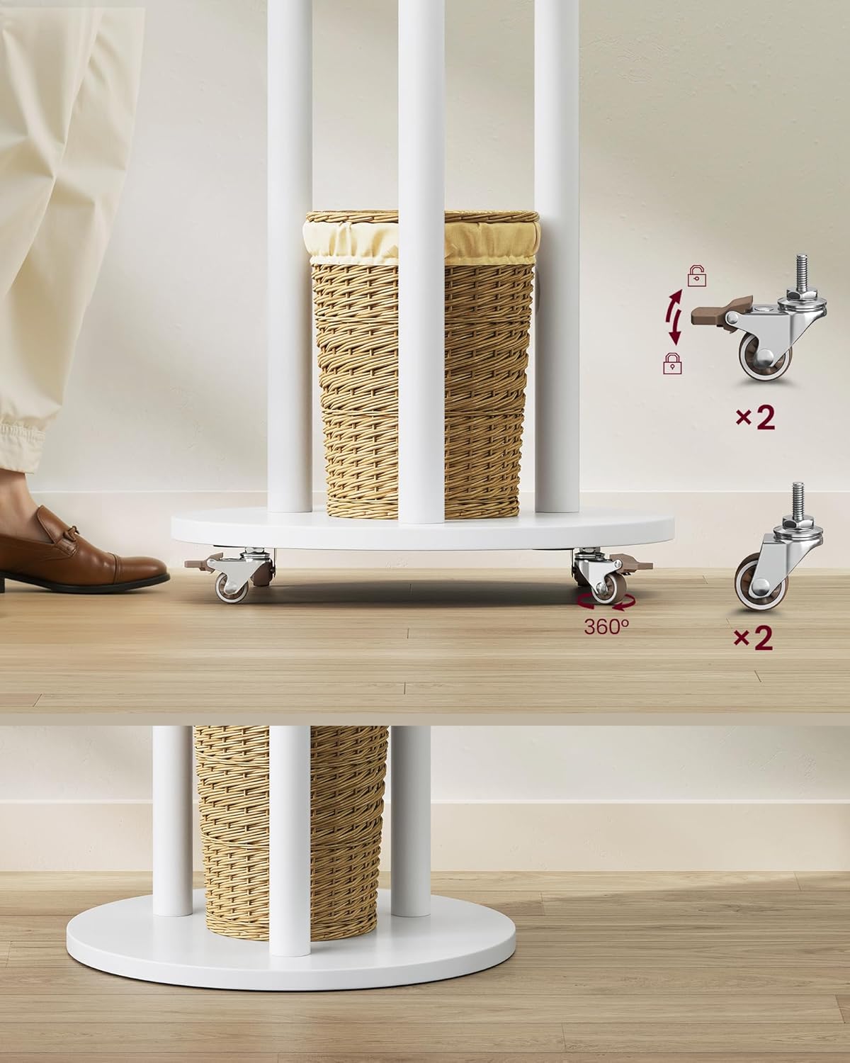VASAGLE Cuier din lemn masiv, cu 11 agatatori si 3 rafturi, 4 roti detasabile rotative 360°, 40x40x175 cm, alb Household NewTrend