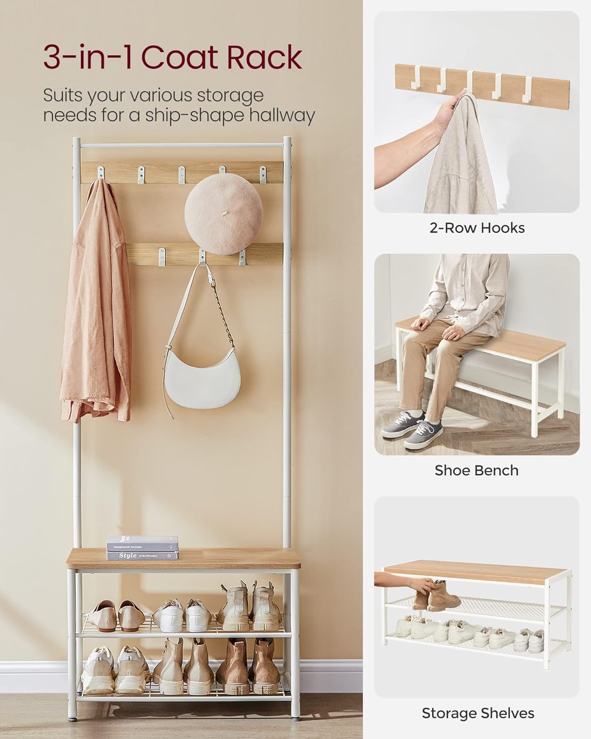 VASAGLE Cuier hol 3 in 1 cu banca si raft pantofi, cadru metalic si PAL, 70x32x177 cm, stejar si crem Household NewTrend