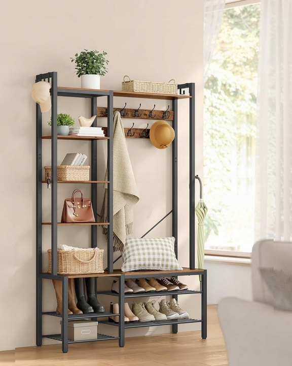 VASAGLE Cuier hol 4 in 1 cu banca, pantofar si rafturi, cadru metalic, stil industrial, 40x120x190 cm, maro rustic Household NewTrend