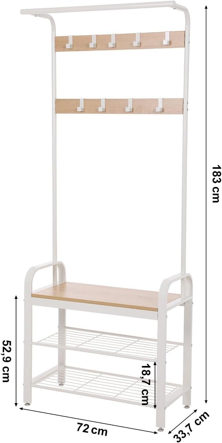 VASAGLE Cuier pentru haine cu banca de depozitare a pantofilor, cu 9 carlige detasabile, o sina pentru haine, 34x72x183 cm, modern, stejar si crem Household NewTrend
