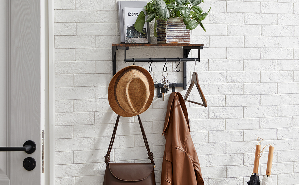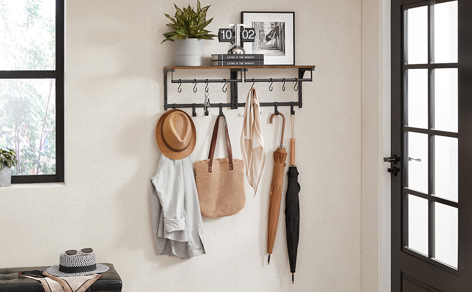 VASAGLE Cuier perete cu 8 carlige si polita, 40x24x24 cm, maro rustic si negru Household NewTrend