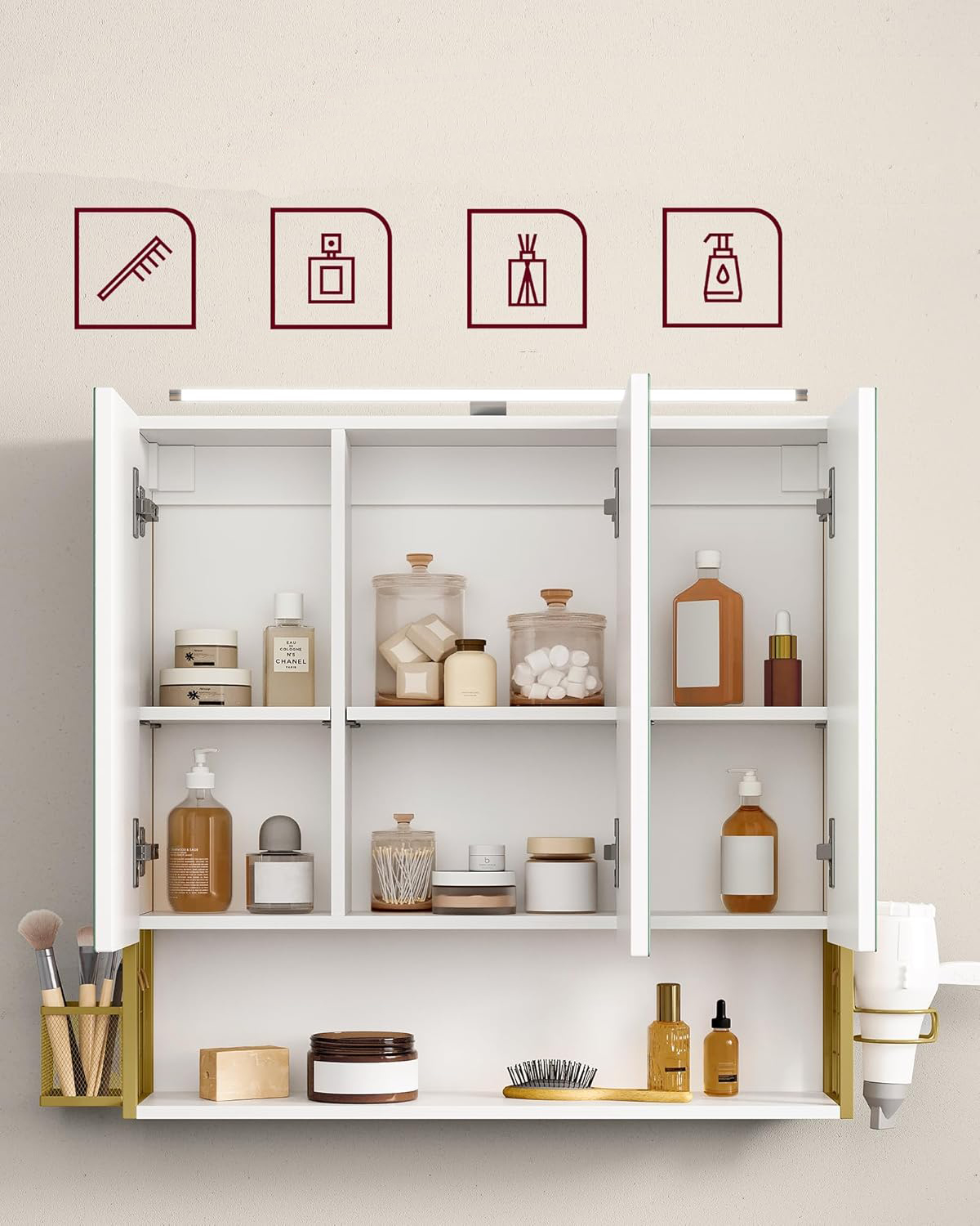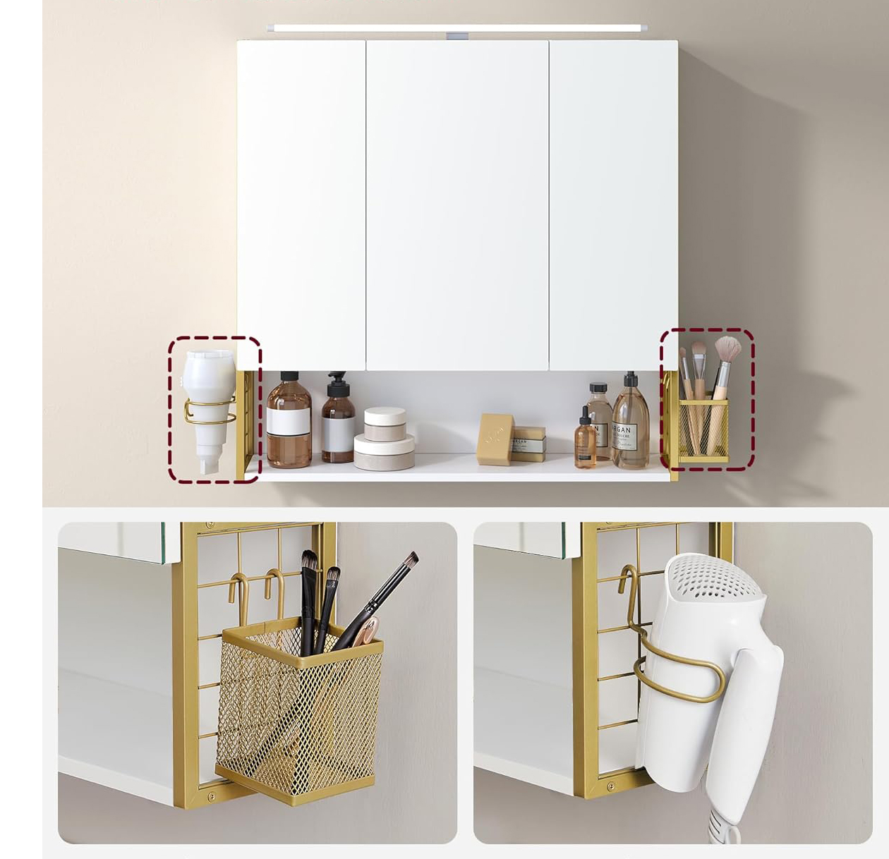 VASAGLE Dulap de baie de perete, 3 usi cu oglinda, compartiment deschis, 15x70x70 cm, alb auriu Household NewTrend