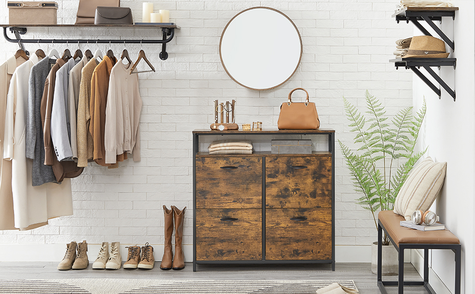 VASAGLE Dulap pantofi din MDF cu 4 usi basculante, pentru 12-20 perechi, 98x30x95cm, maro rustic si negru Household NewTrend