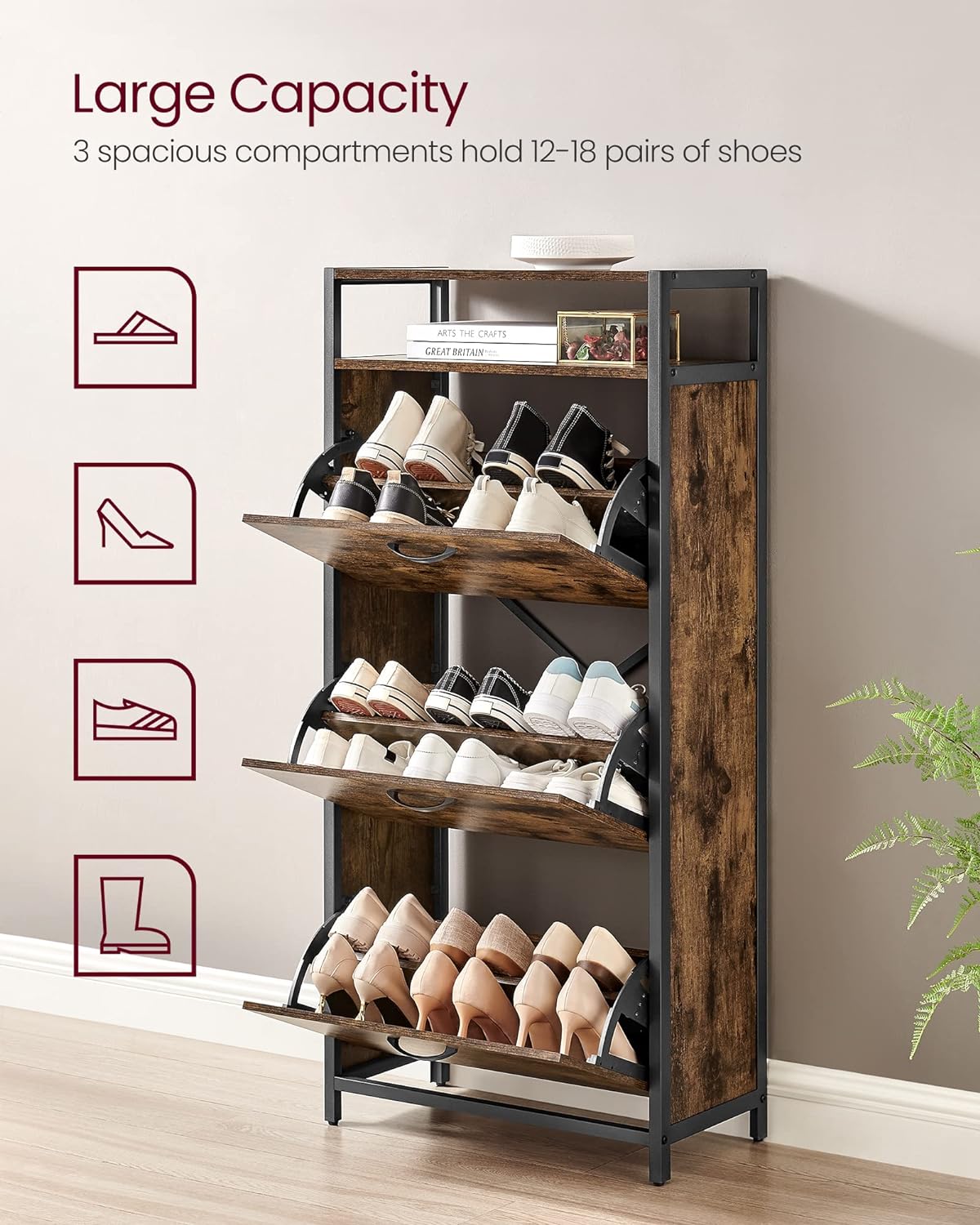 VASAGLE Dulap pentru pantofi cu 3 usi rabatabile, despartitoare interioare, pentru 15-18 perechi, 60x30x130cm, maro rusic si negru Household NewTrend