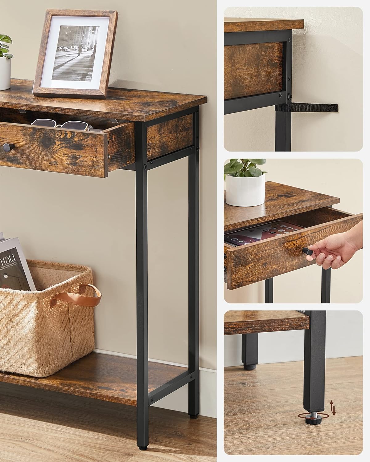 Alege o masa consola pentru hol practica si eleganta, potrivita pentru amenajări moderne, loft sau rustice. Acest model VASAGLE imbina aspectul cald de lemn cu rezistenta unui cadru metalic, oferind un plus de stil in zona de intrare, living sau pe un perete ingust. Cele 2 sertare sunt ideale pentru chei, acte, accesorii sau alte obiecte mici pe care vrei sa le ai mereu la indemana.