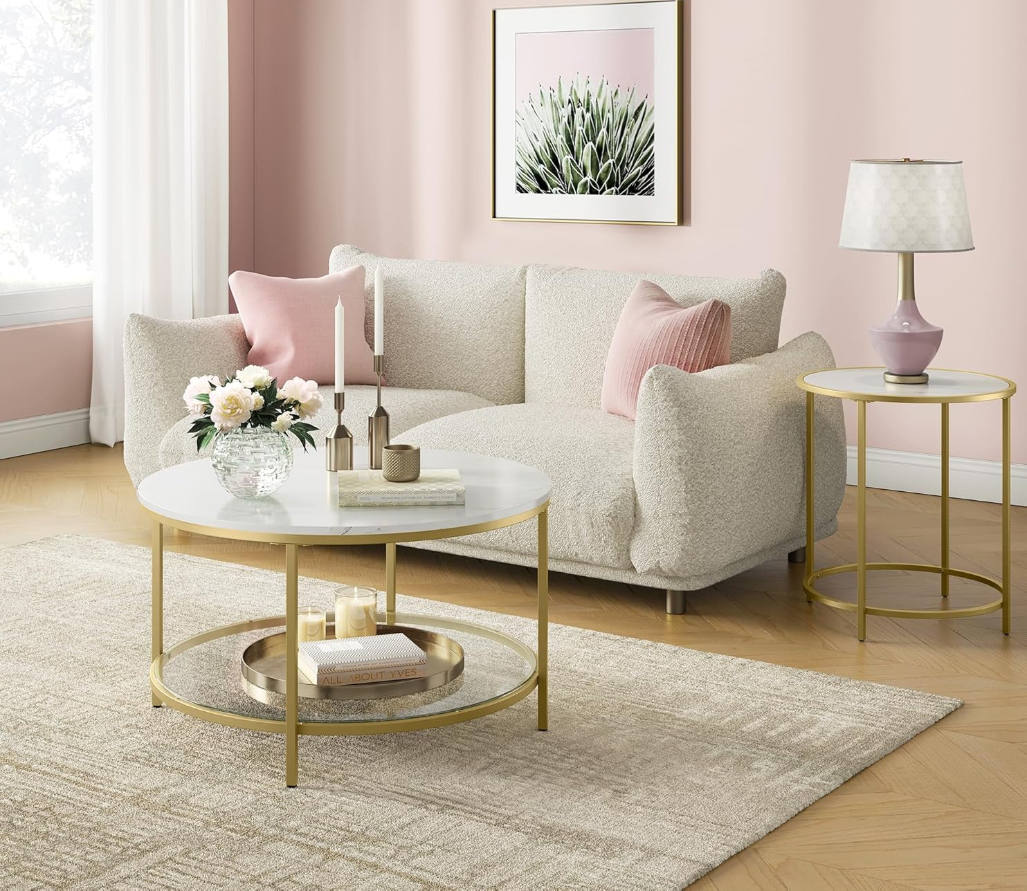 VASAGLE Masa de cafea rotunda cu blat din imitatie de marmura, polita suplimentara din sticla, 80x45cm, alb si auriu Household NewTrend
