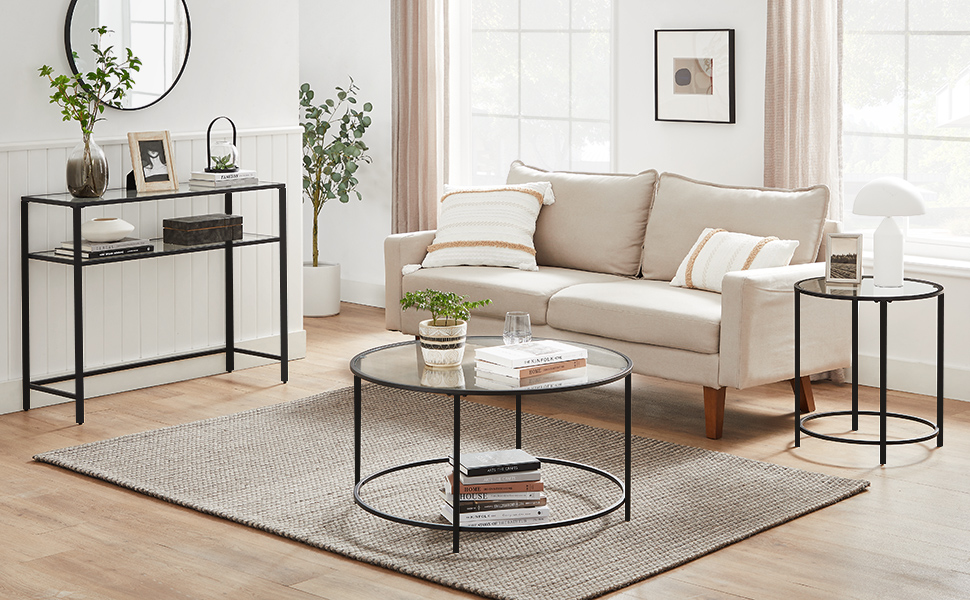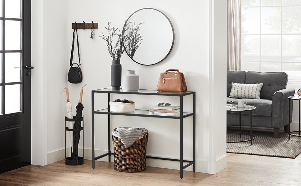VASAGLE Masa de intrare, pe 2 nivele, blat din sticla securizata, cadru metalic, 35x100x80cm, negru Household NewTrend