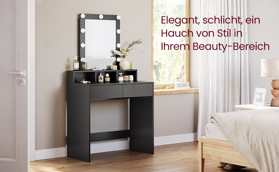 VASAGLE Masa de toaleta cu iluminare LED, cu oglinda, luminozitate reglabila, cu 2 sertare, 80x40x145cm, negru Household NewTrend
