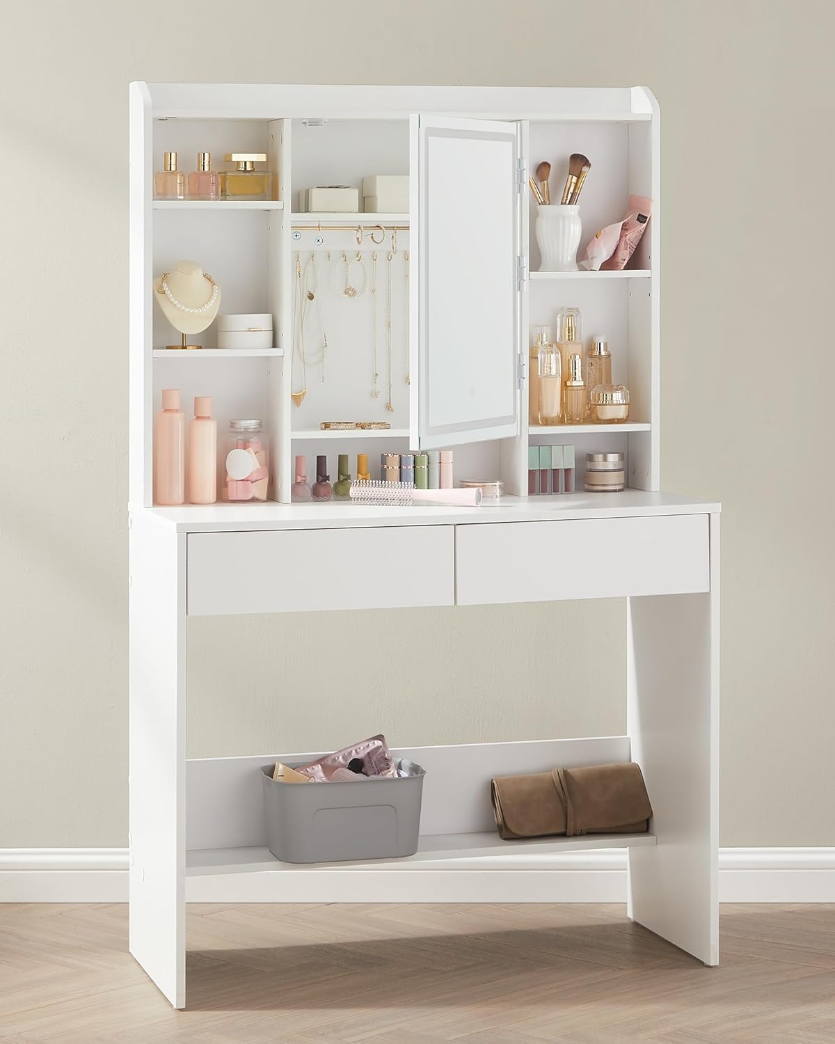 VASAGLE Masa de toaleta cu oglinda, iluminare LED reglabila, 2 sertare, 90x40x145cm, alb Household NewTrend