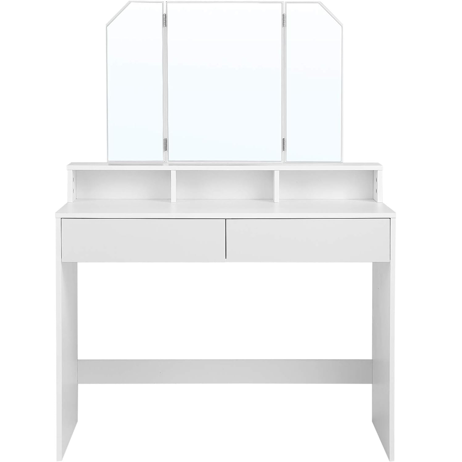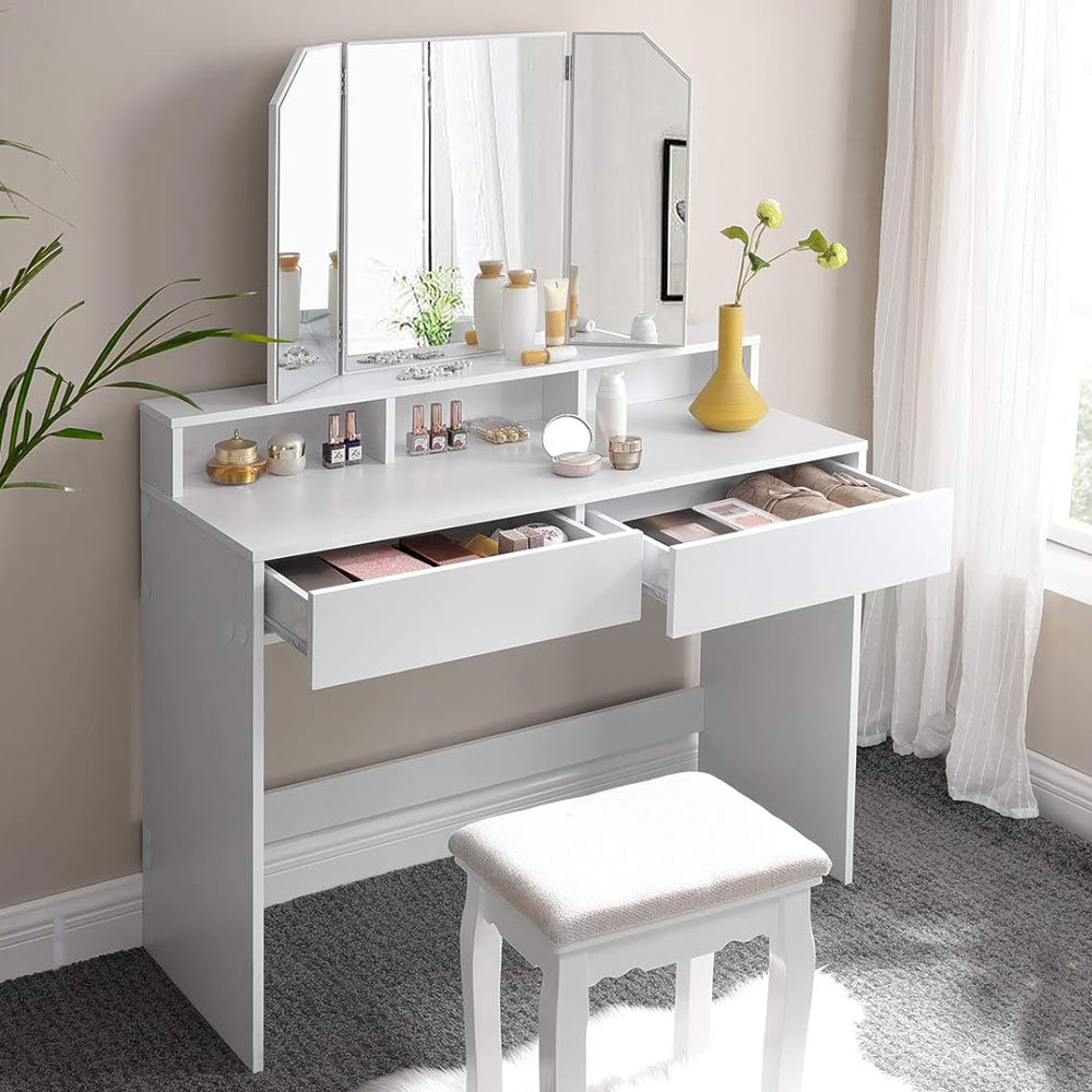 VASAGLE Masa de toaleta cu oglinda rabatabila si 2 sertare, 3 compartimente deschise, 100x40x142cm, alb Household NewTrend