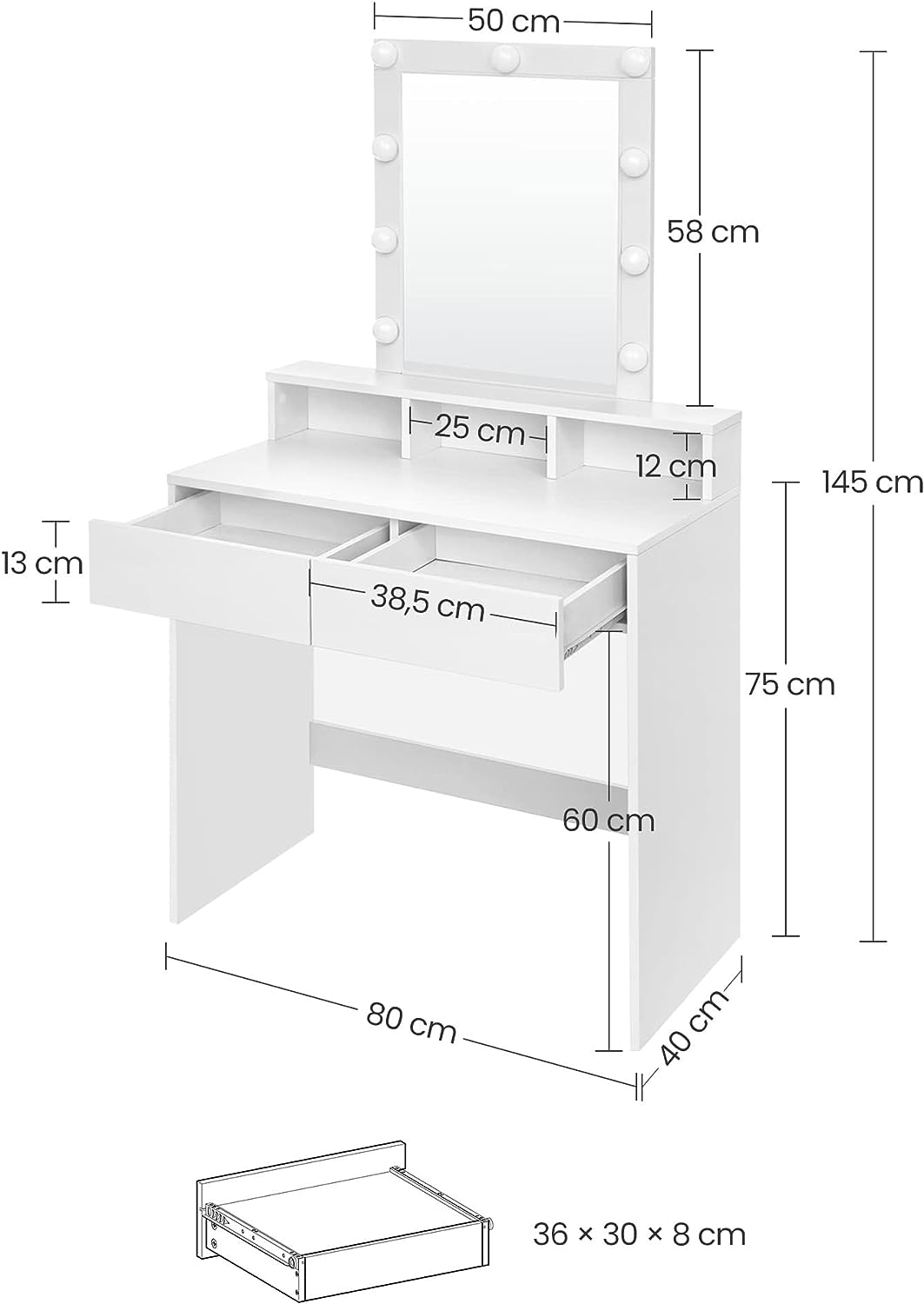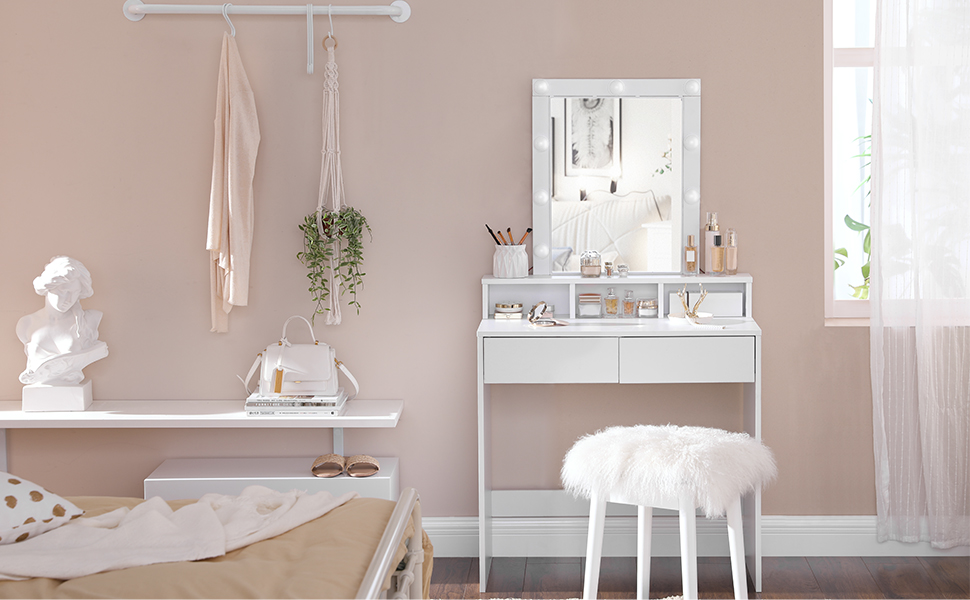 VASAGLE Masa de toaleta cu oglinda si becuri, cu 2 sertare si 3 compartimente deschise, 40x80x145cm, modern, alb Household NewTrend