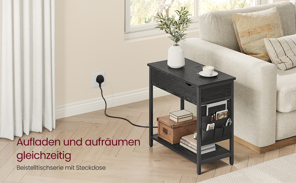 VASAGLE Masa laterala pliabila, tip noptiera, cu prize si porturi USB, raft si geanta din textil, 60x32x60 cm, negru Household NewTrend