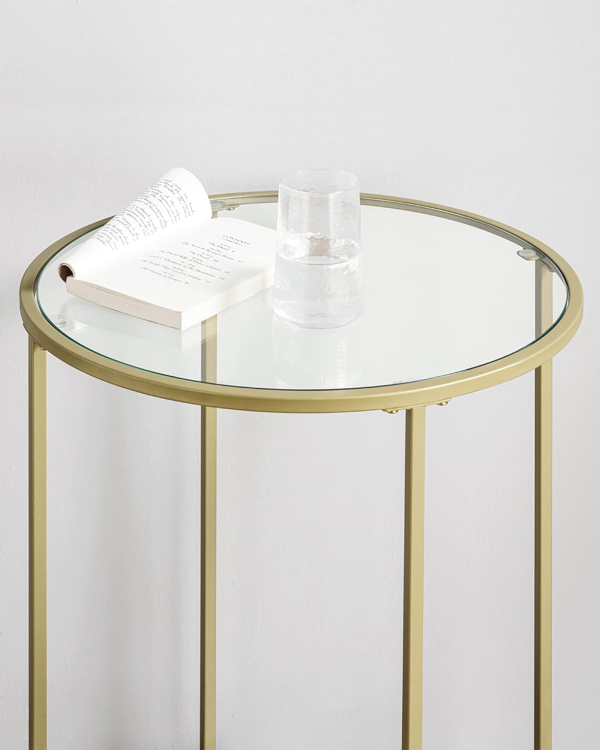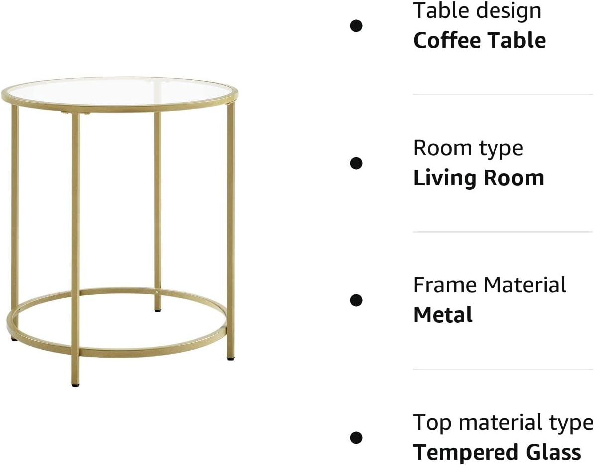 VASAGLE Masa rotunda, din sticla securizata cu cadru de otel, noptiera, 50x50x55cm, auriu Household NewTrend