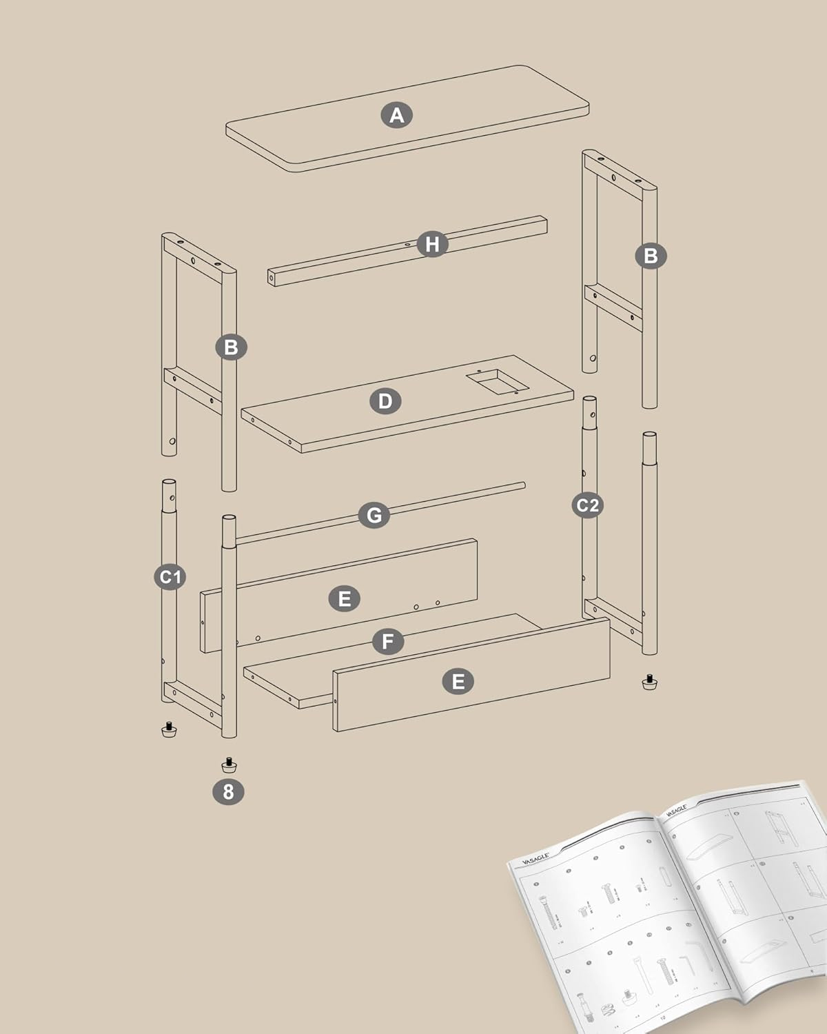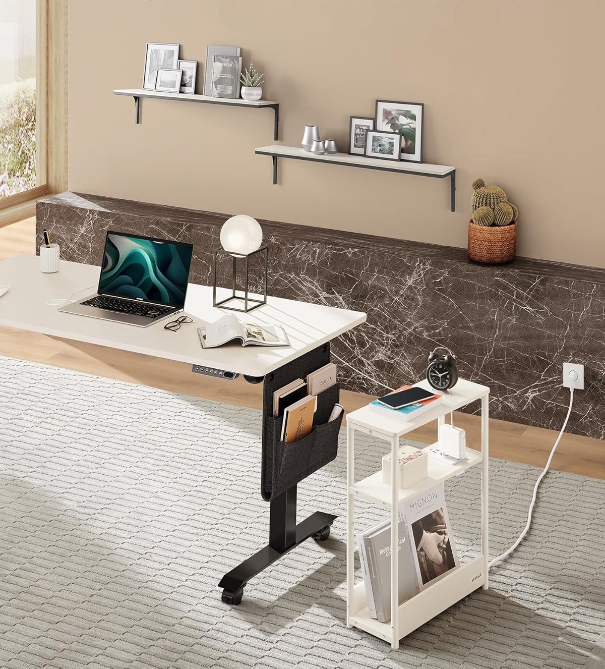 VASAGLE Masuta ingusta cu priza si porturi de incarcare USB, 3 rafturi, 45x18x58 cm, alb crem Household NewTrend