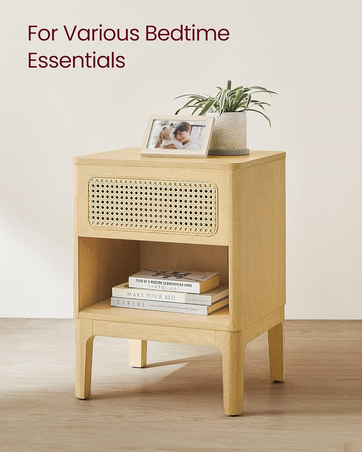 VASAGLE Noptiera 45x40x60 cm, cu sertar aspect ratan si raft, stil boho, PAL si MDF, natur Household NewTrend