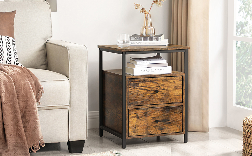 VASAGLE Noptiera cu compartiment deschis, 2 sertare, stil industrial, 45x45x60cm, maro rustic si negru Household NewTrend