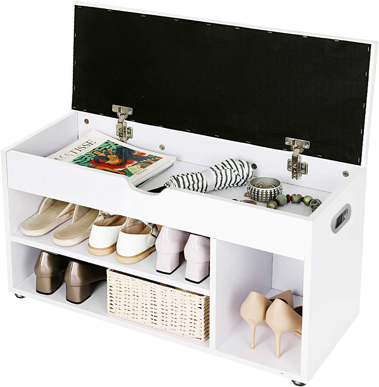 Descriere VASAGLE Pantofar banca, capitonata, 3 compartimente,