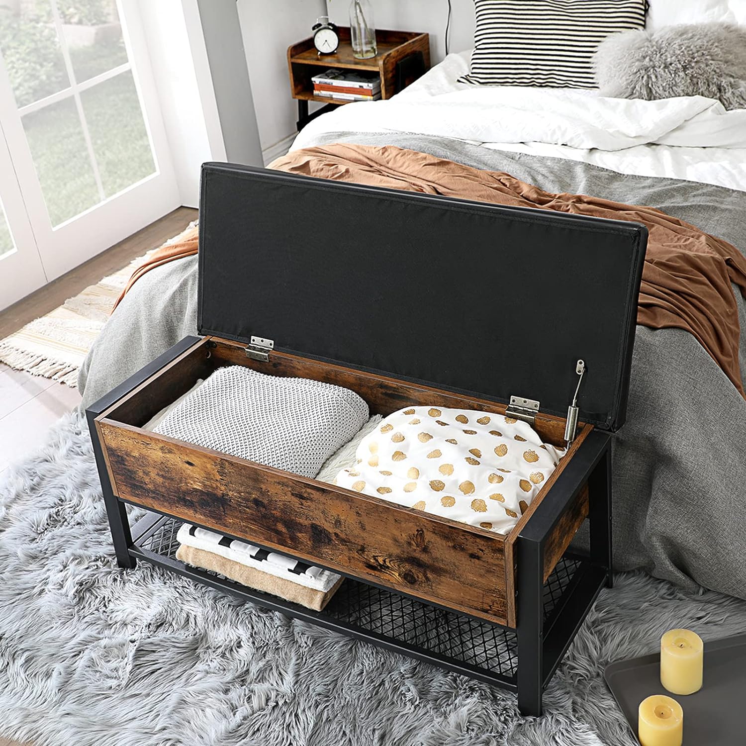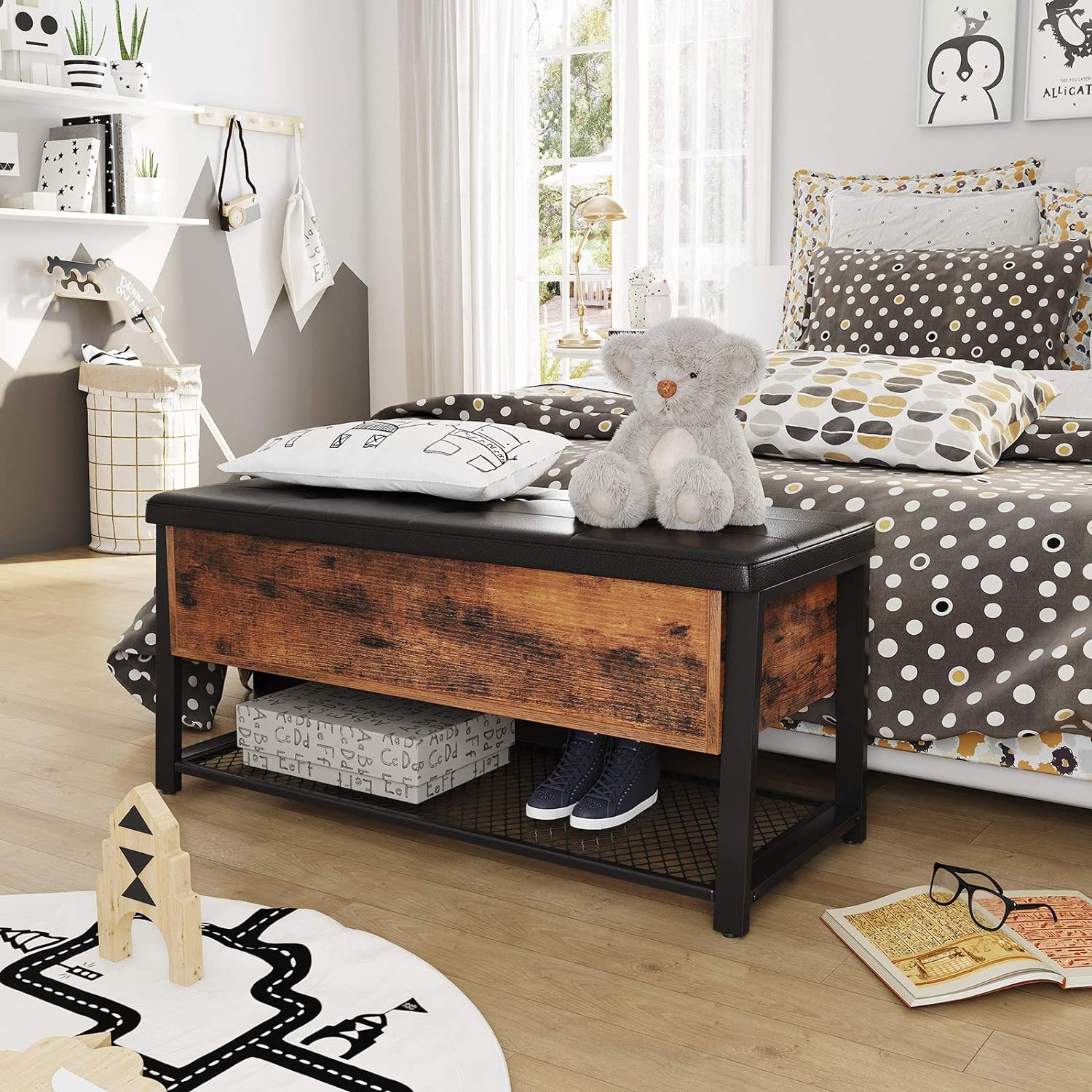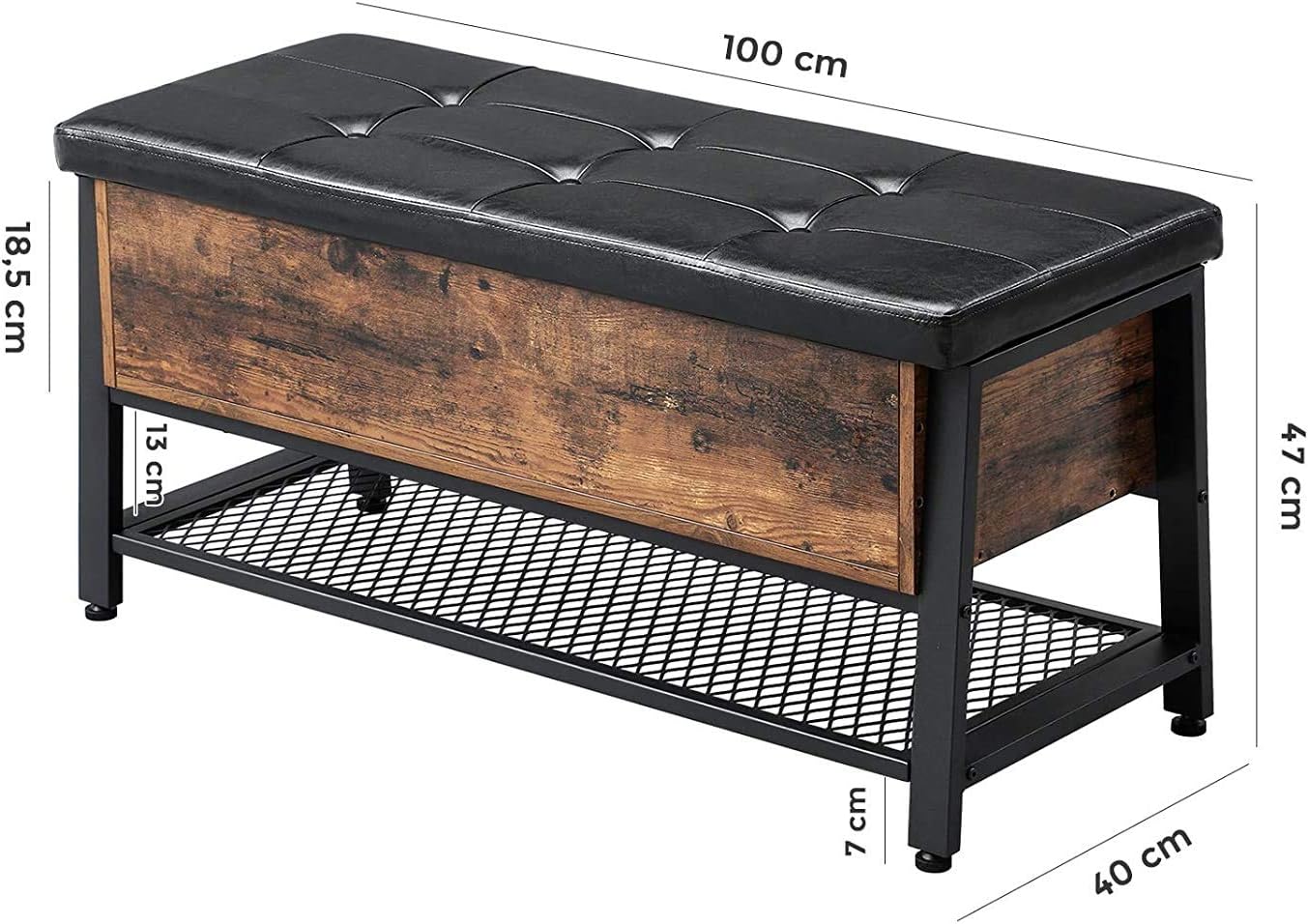 VASAGLE Pantofar de lemn cu spatiu de depozitare tip banca, cu sezut captusit si polita depozitare, stil industrial, 100x40x47cm, maro rustic si negru Household NewTrend