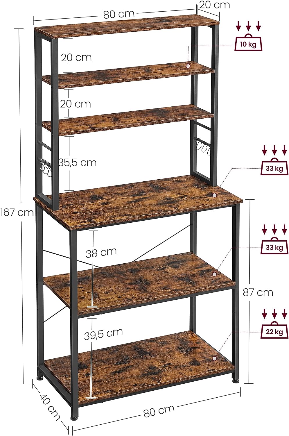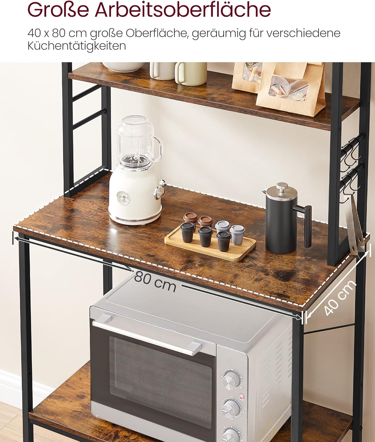 Este o alegere excelentă pentru bucătării mici, colțuri de cafea sau zone unde ai nevoie de mai multă ordine. Cele 6 rafturi oferă spațiu bine compartimentat, iar raftul inferior din mijloc este reglabil pe 2 înălțimi, astfel încât să poți așeza ușor blenderul, friteuza cu aer cald, cuptorul cu microunde, oale sau alte accesorii. Cele 6 cârlige în S sunt practice pentru ustensilele pe care vrei să le ai mereu la îndemână.